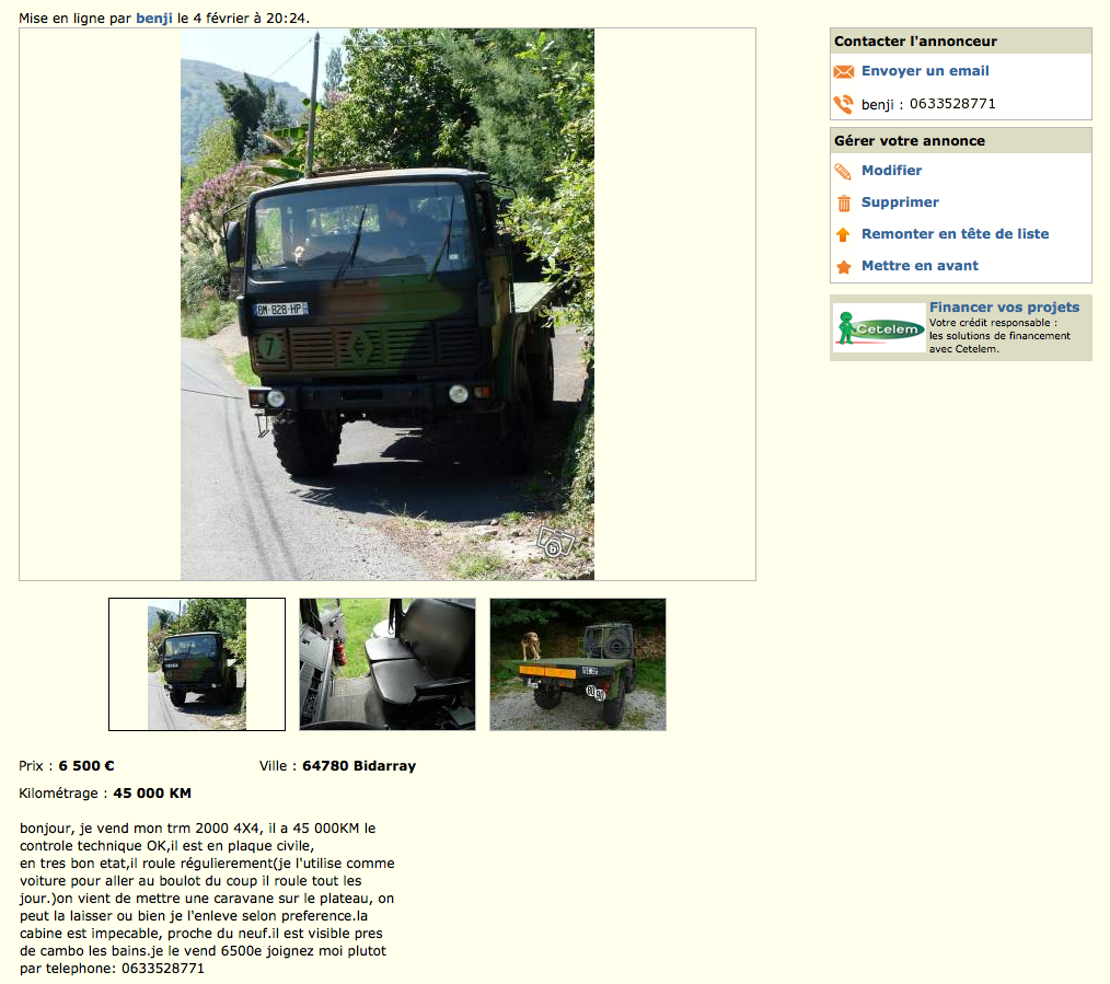 bon je la colle là plus pour garder les photos qu'autre chose....car curieusement il ne met que le prix du camion et pas de la cellule.... donc je pense que celle ci sert plus de faire valoir pour vendre les porteurs...