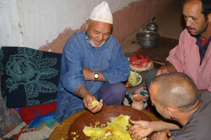plein de pour les reserves d'eau au bas du village couscous , l'art de fire des boules de semoule et les avaler entière c 'est après avoir recherché ce village pendant 2ans ou j'avais fais cette promesse que j ai pris en stop cet homme sur la piste et comme le hazard fait bien les choses , il habte le village juste en dessous de celui qu cherchais Agadir on le vois de chez lui a 100m a vol d 'oiseau Ce sont des gens super sympa, accueillant , mais d 'une pauvreté désarmante
