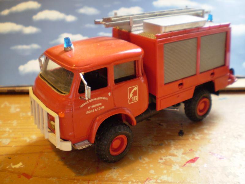 <<saviem 4x4 pompier au 1/43 beaucoup de travail car il a fallut faire une double cabine sur la base norev le châssis a été conservé , les essieux rehaussés et une caiise solido rajouté tout cela au 1/43>>