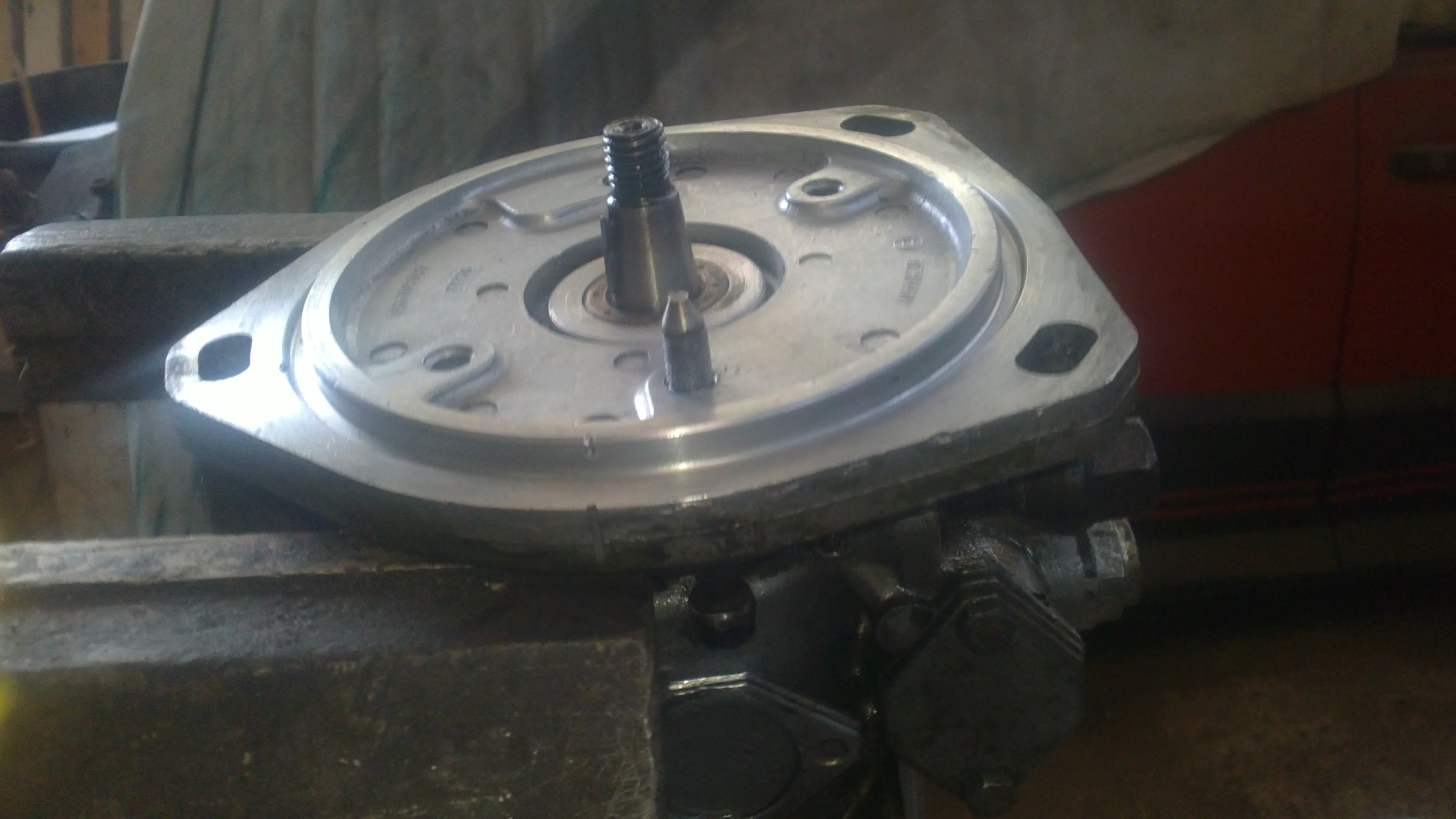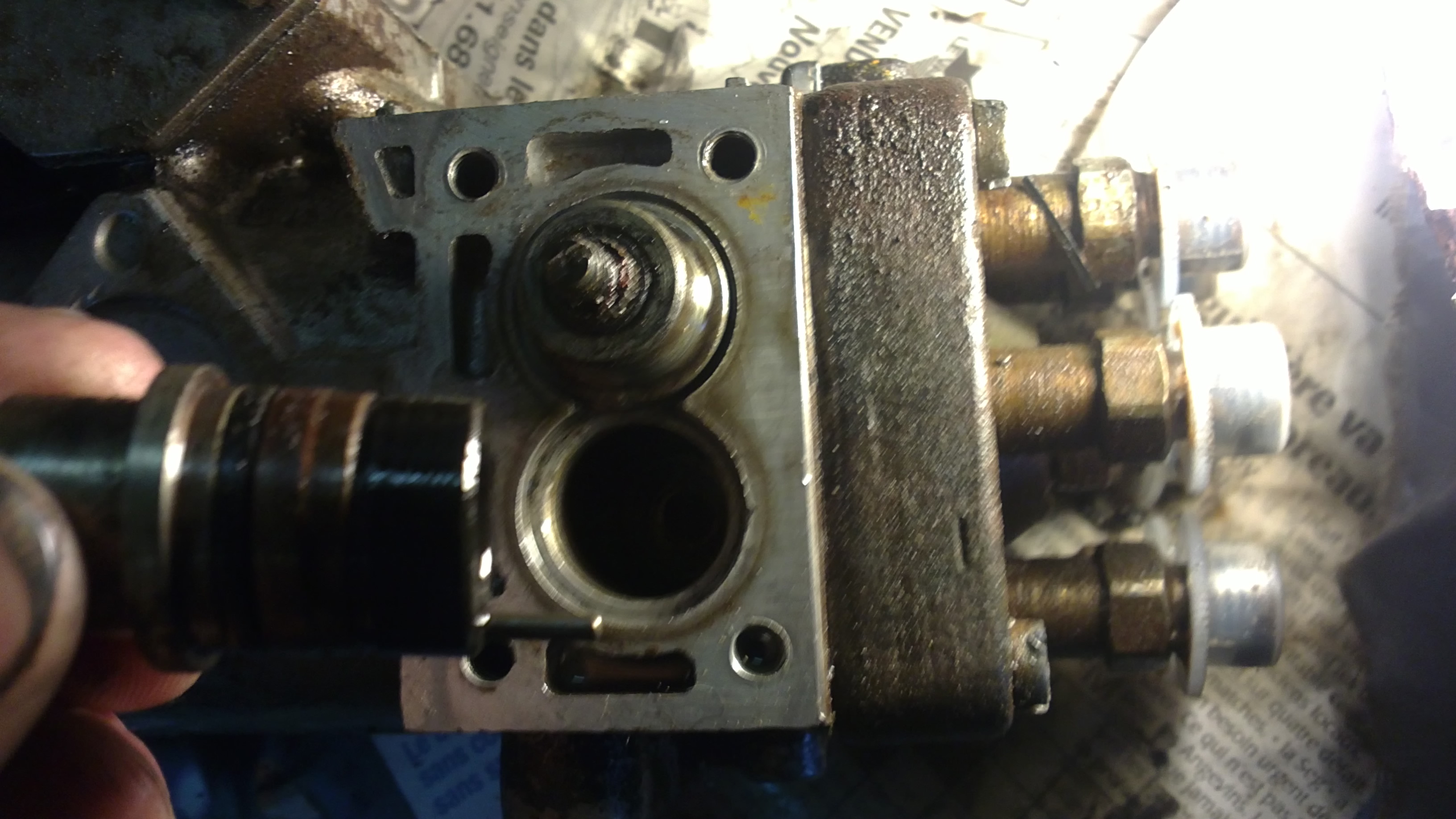 donc comme je l'avais dit plus haut ! avant de sortir le cul de la pompe, démontez la plaque latérale avec les biellettes de commande et sortez les axes avec leur porte joint (attention il y a des ressorts et des cales au bout des axes !!) on voit sur la photo la tétine de commande qui est très très fragile !