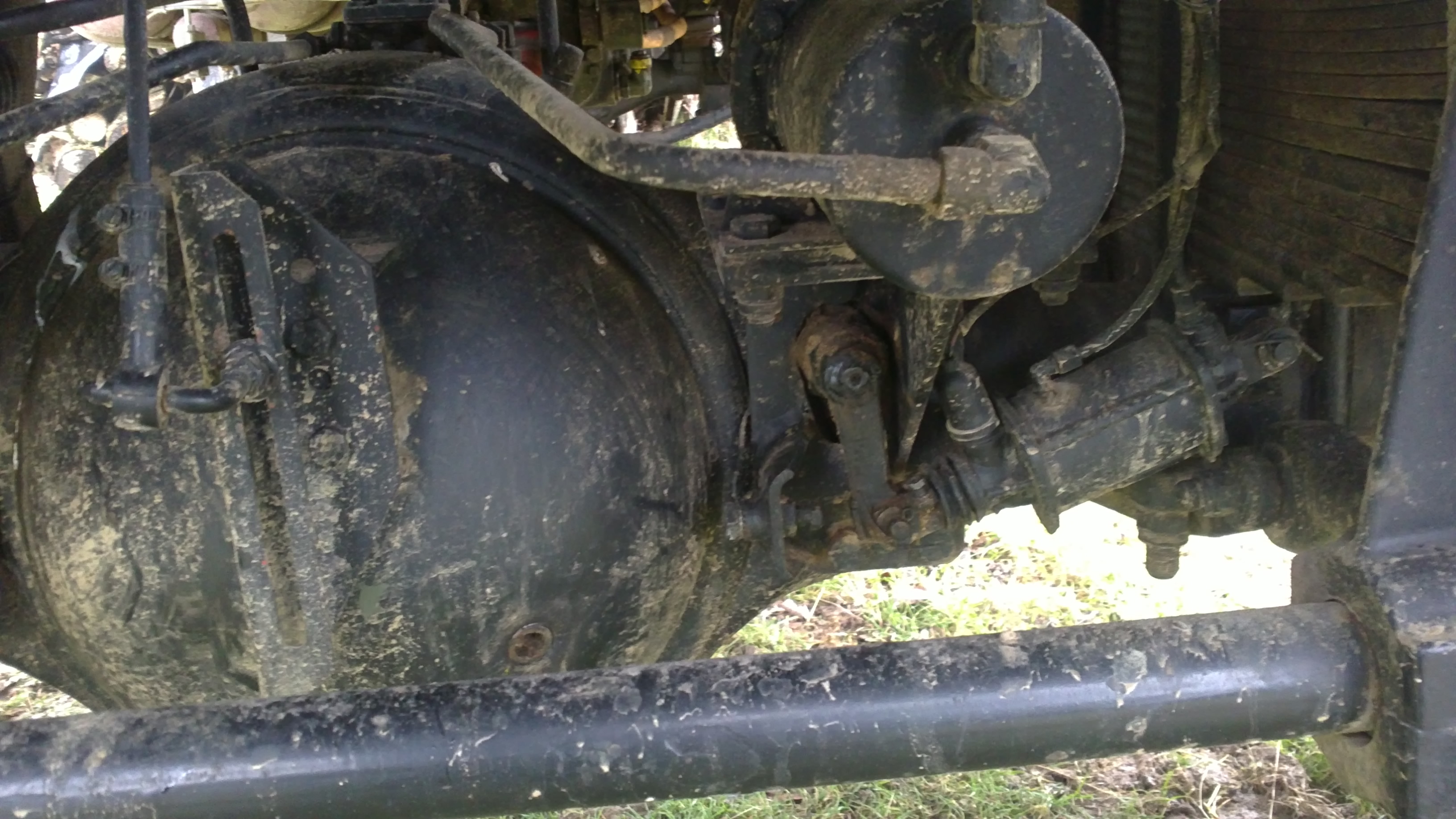 Aujourd'hui nous nous sommes attaquées à la comparaison des tours de roues avec les tours d'arbres de transmission. Ce contrôle visuel nécessitant de bonnes compétences en précision nous avons constitué un binôme uniquement féminin pour accomplir cette tâche 8) Le tonton a bien démarré et il est monté normalement en air après quoi, j'ai décroché le frein de parking (à gauche) et coupé le moteur. Des cales ont été installées pour la sécurité. Consciente que cela n'a aucune sorte d'importance, le cric a d'abord été placé sous le pont avant côté droit, la roue fut décollée d'un bon centimètre du sol pour permettre un mouvement fluide. A l'aide d'une craie d'écolier, deux repères ont été marqués, l'un sur la roue l'autre sur l'arbre. Tu tournes-je compte et note le résultat à chaque tour de roue. Dix tours de roue, allez dix de plus et puis un compte rond d'arbre alors vingt-quatre tour de roue. Ensuite, opération identique pour l'arrière. La vache, les jumelles sont lourdes ok alors je tourne-tu comptes. Rebelote vingt-quatre tours et un compte rond.