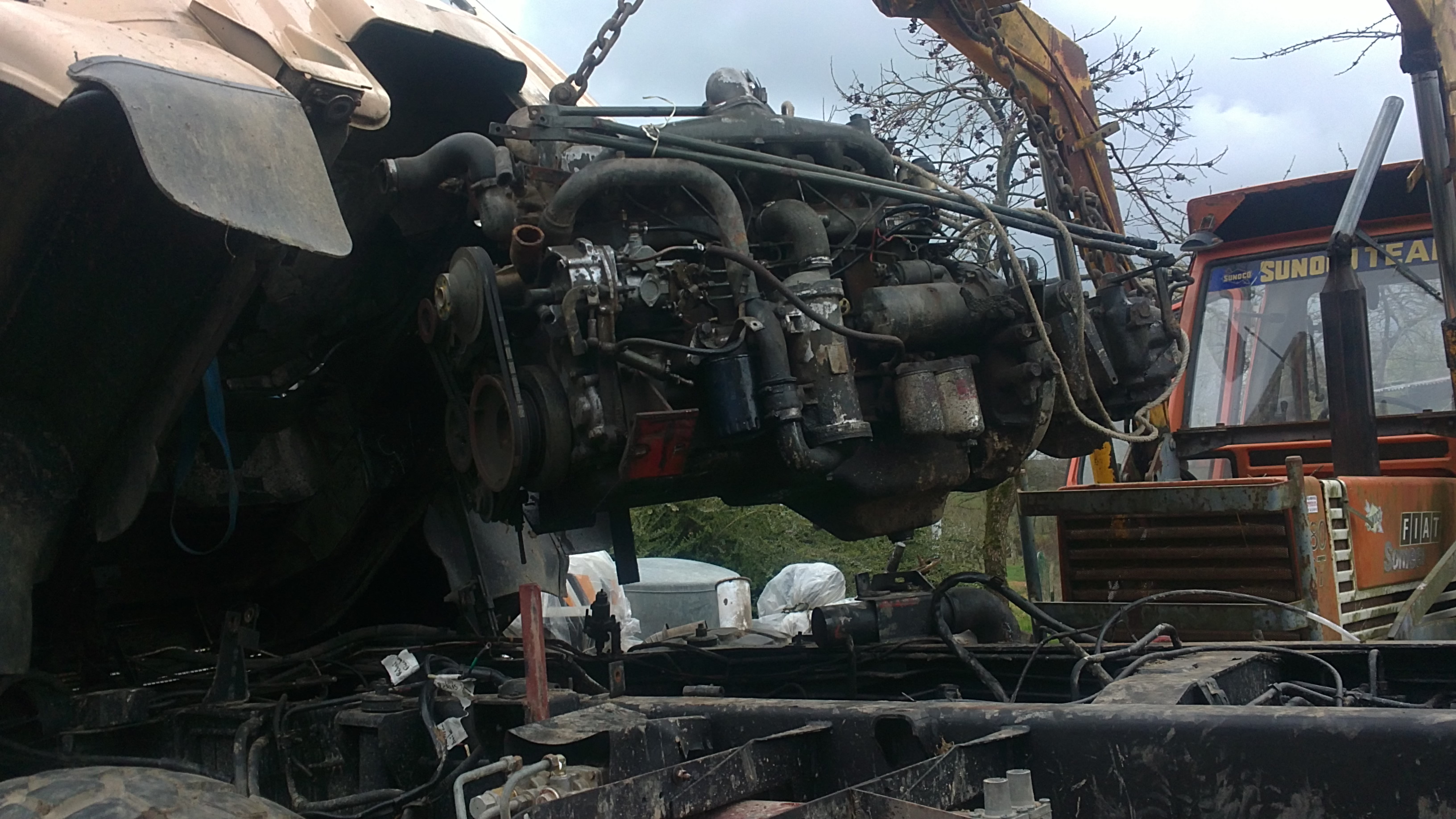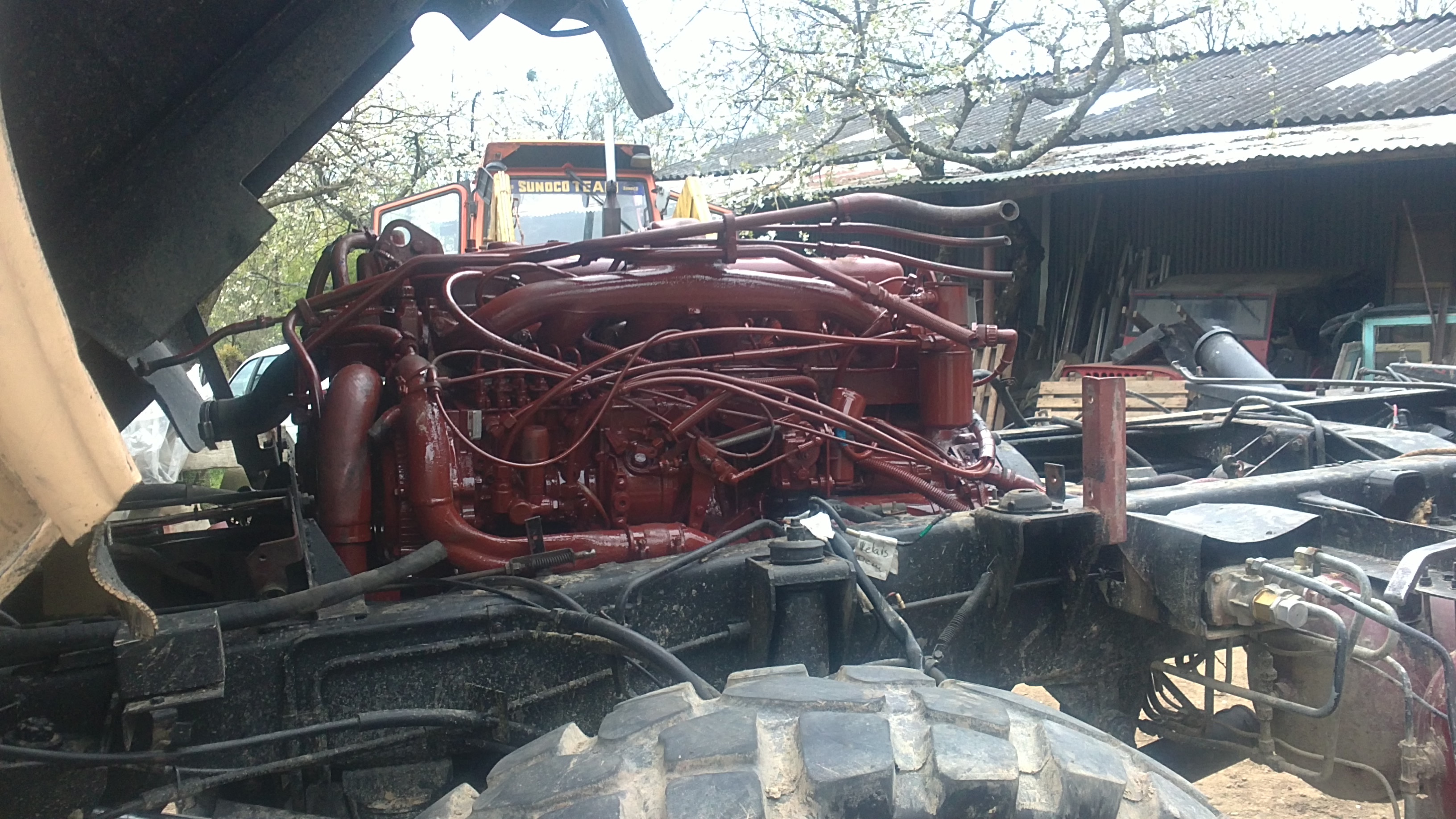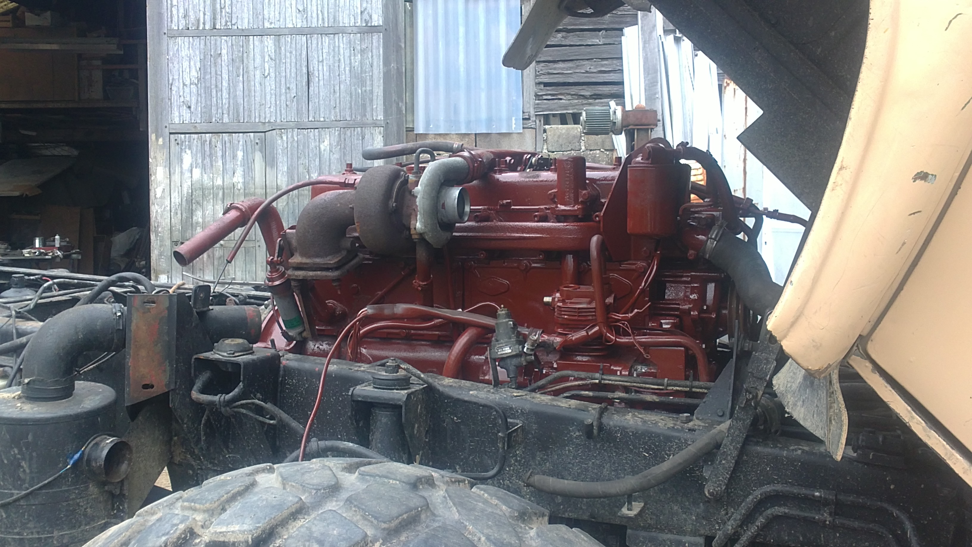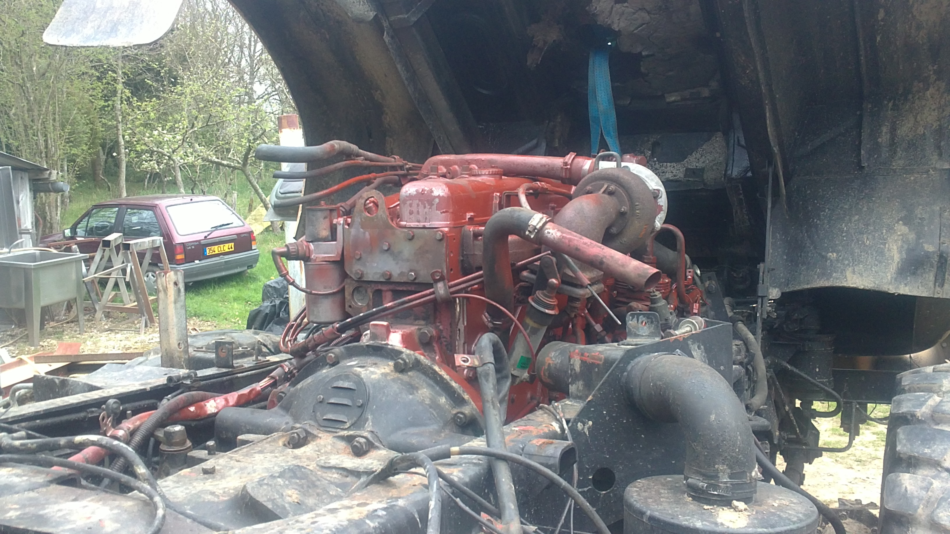 J’ai mis un moteur renault midliner 06.02.12.D. C’est assez facile car c’est le même bloc que le 797 d’origine. Attention , il y a eu une modification à faire au niveau de l’embrayage. Je ne sais plus exactement en quoi cela consistait mais on a du faire une pièce d’adaptation. Un petit découpage dans la cabine a permis de placer le turbo avec ses tuyaux et une longue conduite a été nécessaire pour amener l’ air à l’intercooler placé sur le toit. Je n’ai pas touché aux arbres et boites de vitesses.