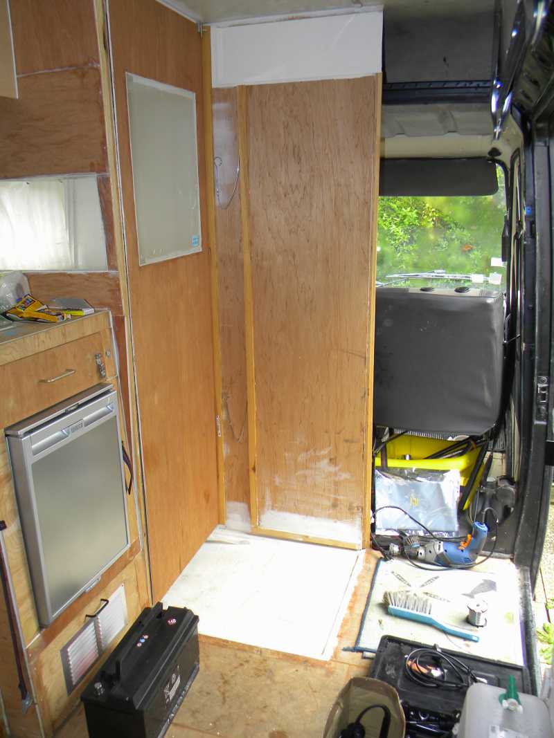 Coin wc/douche : le système à double porte sera remplacé par un simple rideau (car sinon on ne peut pas aller au wc en cas d'envie pressante quand, par exemple, il y a une personne qui dort par terre sur un matelas)