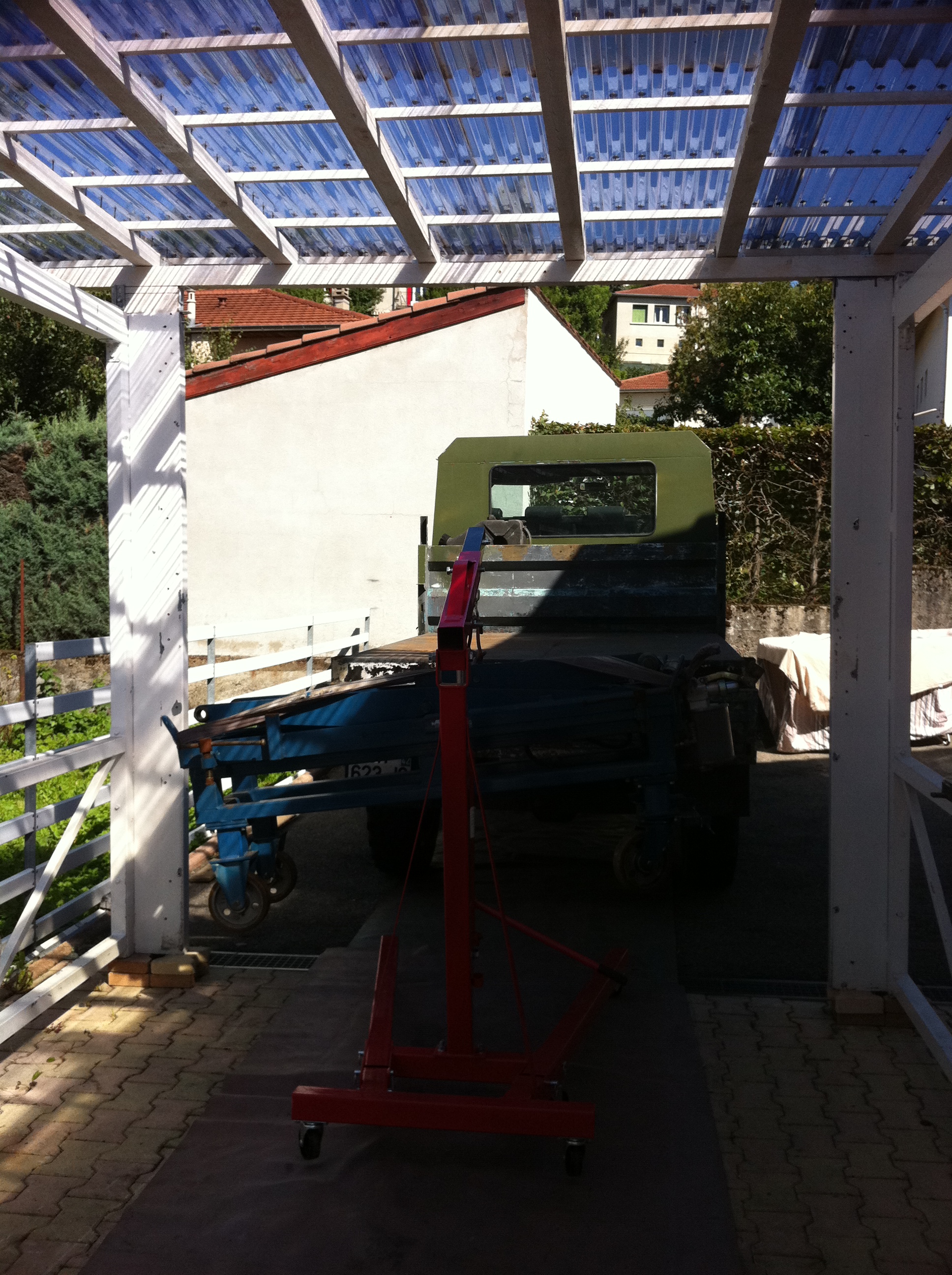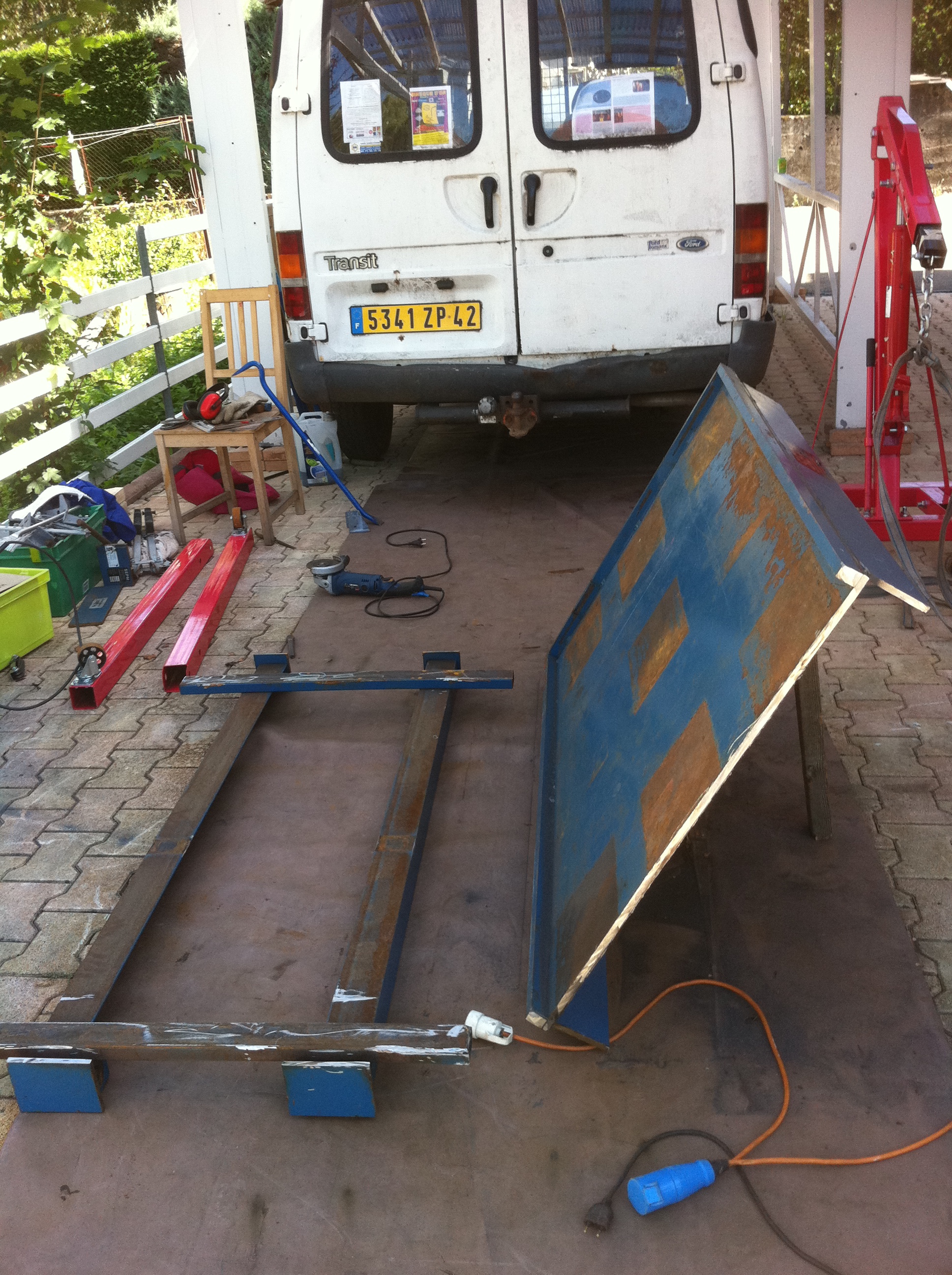ça y est j ai enfin pu désaccoupler l'armature du plateau gain de poids oblige je vais aussi modifier la hauteur de table la rabaisser de 15cm ça supprimera une partie du support actuel qui est aussi pas mal lourd et me permettra de faire un autre système de fixation par boulonnage j'y grefferai aussi des pieds pour pouvoir tout déposer afin de me servir du zipou en pick up, je vais faire un cadre de soutient pour la zipette avec aussi des fixations par boulonnage les sangles ne seront que des sécurités supplémentaires et je vais aussi modifier le positionnement de la table sur le zipou je vais la mettre dans l 'autre sens pour cela je vais déplacer la pompe pour la passer dessous la benne à coté du réservoir , les projets ne manque pas mais je ne vais peut être pas y faire dans l'immédiat car je suis un peu débordé par d'autres tâches et d'autres impératifs mais ce sera très bientôt ...j espère !