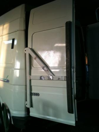 - Les portes arrières commencent à se découper. C’est le battement du porte-roue de secours, monté sur les gonds d’origine qui est en cause. Pas de problème: armé de mon meilleur pote, un artisan magicien du métal, on modifie le porte-roue pour répartir les points d’appuis sur la porte. On renforce aussi les gonds en installant des douilles qui répartissent l’effort sur tout le montant. Enfin, on renforce le patin de point d’appui inférieur de la porte gauche en position fermée. Un petit coup d’époxy par là-dessus, et on n’en parle plus.
