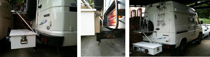 - Porte-vélo sur roue de secours. Pas question de nous balader sans nos biclous. Là, on s’est pas foulé. Comme le support de roue de secours et les portes arrières sont déjà très renforcés par nos soins, on a juste déniché sur eBay un rack porte-vélos qui se monte par dessus ladite roue de secours. Histoire de ne prendre aucun risque, on a quand même installé une jambe d’appui sur le marche-pied arrière et un tirant supérieur sur la galerie. On n’est jamais trop prudent...