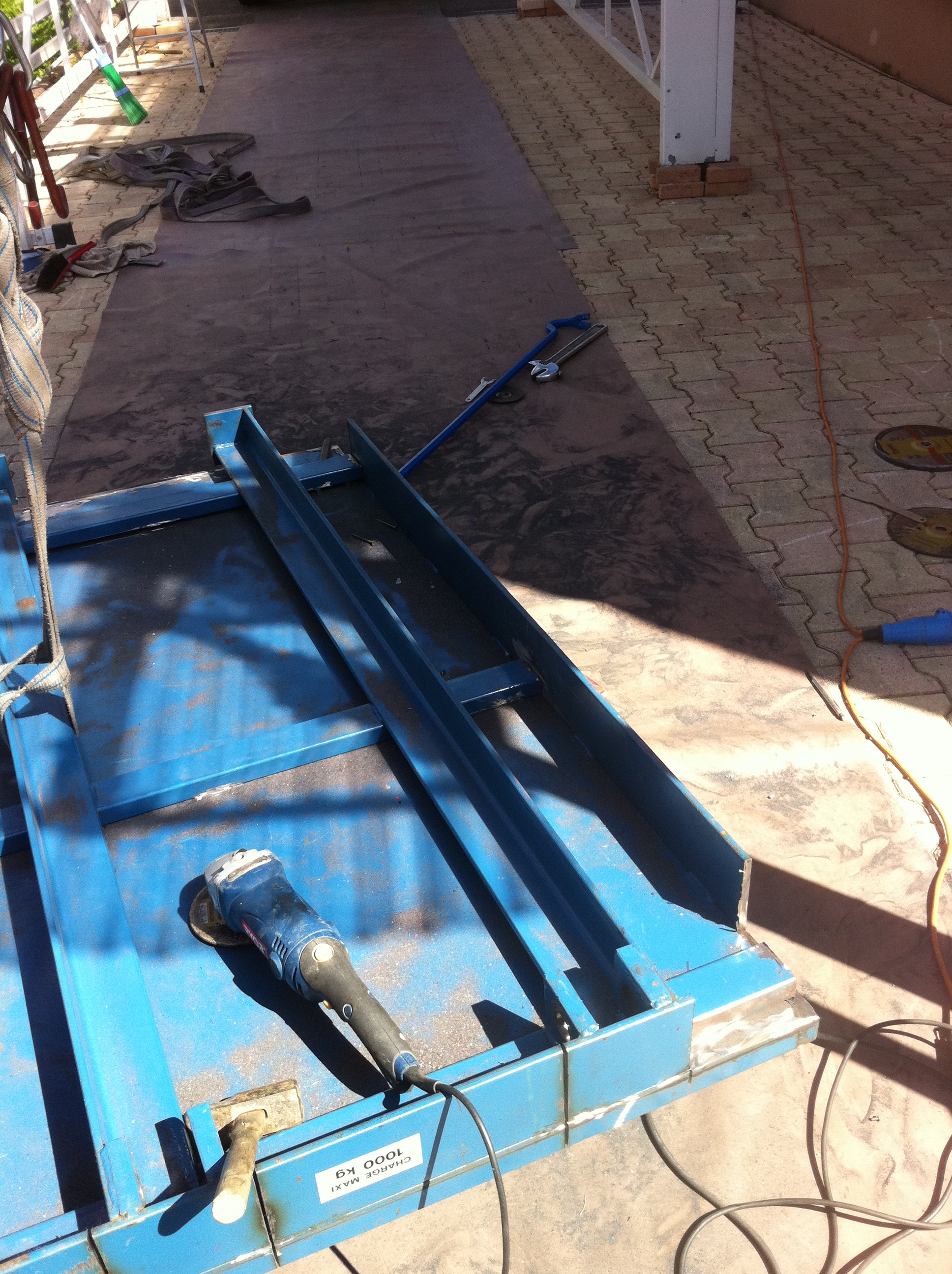 ça y est j ai enfin pu désaccoupler l'armature du plateau gain de poids oblige je vais aussi modifier la hauteur de table la rabaisser de 15cm ça supprimera une partie du support actuel qui est aussi pas mal lourd et me permettra de faire un autre système de fixation par boulonnage j'y grefferai aussi des pieds pour pouvoir tout déposer afin de me servir du zipou en pick up, je vais faire un cadre de soutient pour la zipette avec aussi des fixations par boulonnage les sangles ne seront que des sécurités supplémentaires et je vais aussi modifier le positionnement de la table sur le zipou je vais la mettre dans l 'autre sens pour cela je vais déplacer la pompe pour la passer dessous la benne à coté du réservoir , les projets ne manque pas mais je ne vais peut être pas y faire dans l'immédiat car je suis un peu débordé par d'autres tâches et d'autres impératifs mais ce sera très bientôt ...j espère !
