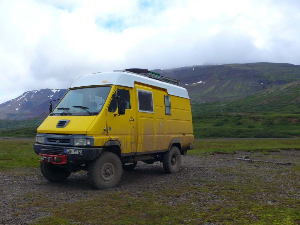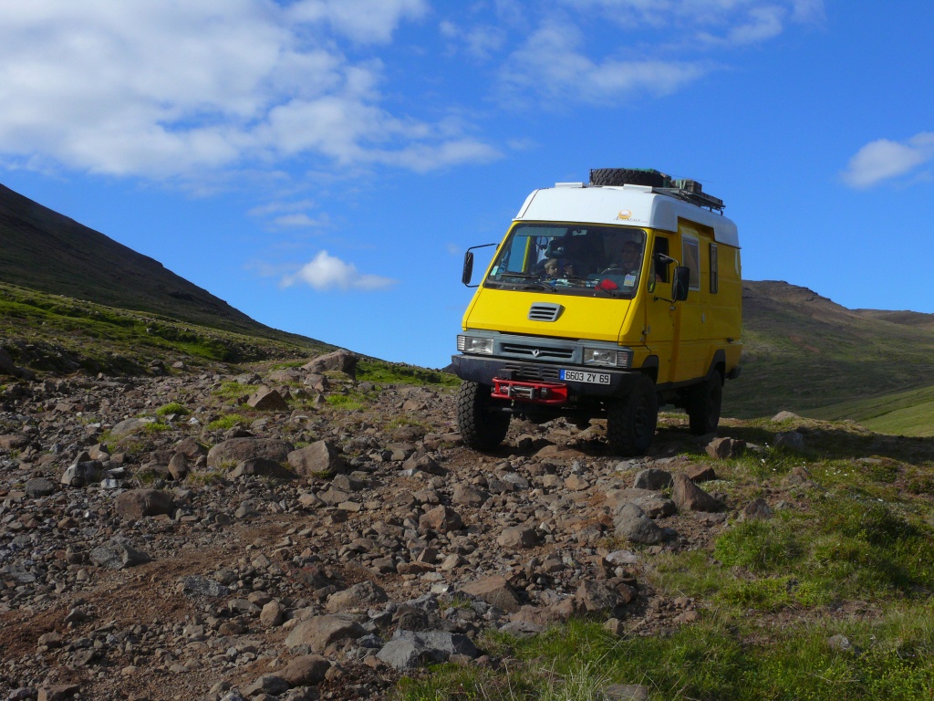 Je t’envoie des photos de notre dernier voyage de 4 semaines en Islande (pas très original). Notre B chaussé de ses pneus tout neufs a fait merveille. Nous avons pu à nouveau nous féliciter de ses capacités de franchissement étonnantes, et de l’abri confortable qu’il offre à toute la famille lors des intempéries. Nous nous sommes un jour lancés sur une piste que nous pensions balisée, mais, avec les années, qui s’est révélée ne plus être entretenue et l’expérience a tourné en opération terrassement frissons devers éboulis et souvenirs… Nous ne sommes pas des cadors du trial non plus, il faut bien l’avouer, mais l’engin a atteint quelques fois ses limites.