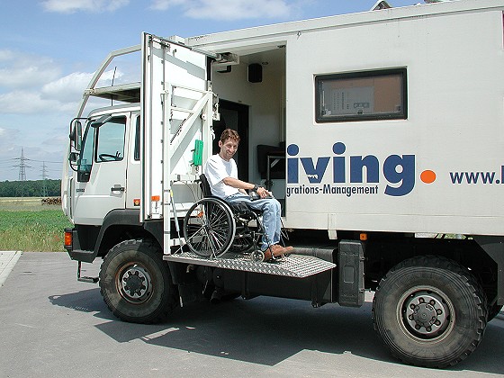 Il existe des systèmes pour les personnes invalides pour les faires montées dans les camions, je l'ai sus quand je parler avec Chris (Landy) qui m'expliquer que mon copain, lui aussi invalide, peut lui aussi faire du Camion 4x4 =).
