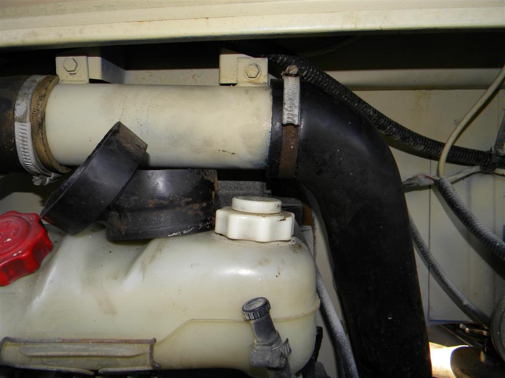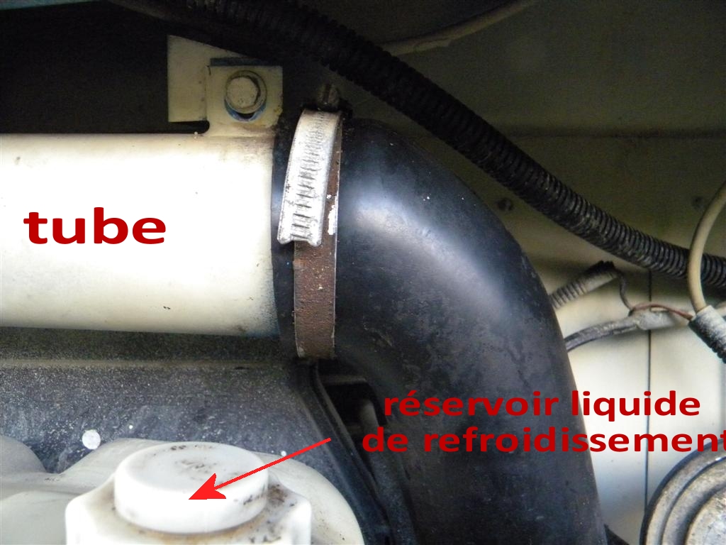 attention à ne pas (re)couper trop court la durite ! j'ai été obligé de déposé le tube (2 vis) pour fixer la durite raccourcie de droite, et à l'aide d'une cale en bois sur le réservoir de liquide de refroidissement, après avoir refixé la vis de gauche de support du tube, remonter l'ensemble (transpiration au rendez vous ! )
