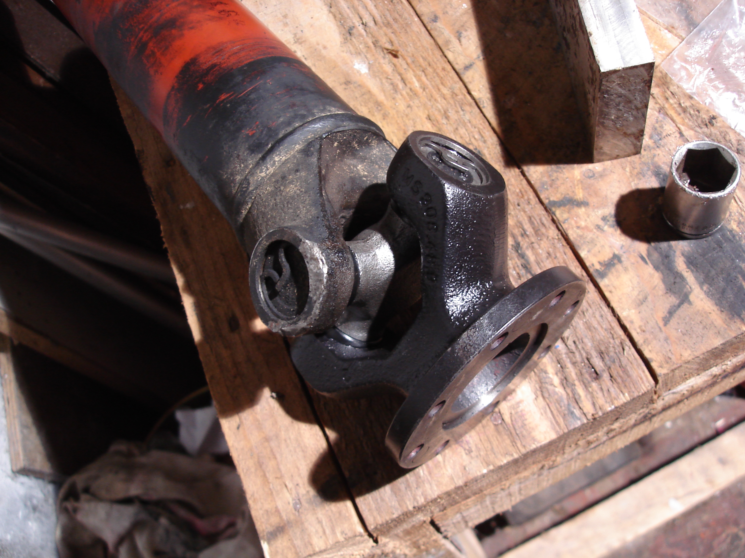 Remarque : l'arbre de transmission est tenu sur la BT par 4 boulons et il n'y a pas de centrage mécanique (épaulement par ex) les deux flasques sont plats. Il y a du jeu dans les trous des boulons (qui sont filetés sur toute la longueur en plus) J'en ai conclu que le centrage pouvait ne pas être parfait.