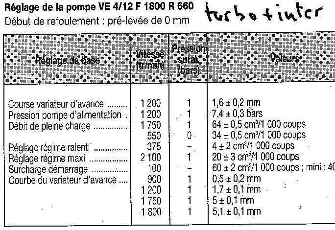 Dans les données que j'ai récupérées le calage de la pompe est bien le même pour les deux moteurs (2,5 L), donc je me dis que je ne vois pas comment régler l'avance puisque c'est la même dans les deux cas. J'avance pas à pas... enfin j'essaye car à la vue des tableaux de Bruno (merci) c'est sûr que si on peut jouer sur beaucoup de ces valeurs, ça fait beaucoup de réglages ! Bruno, tu ne peux pas nous trouver les mêmes pour nos moteurs ?