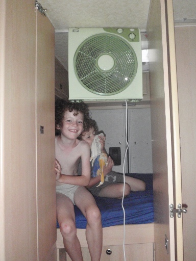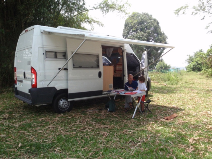 Je n’étais pas convaincu de la nécessite du auvent. A posteriori, comme on doit faire cours aux deux enfants, ca permet d’en mettre un à l’intérieur et un sous l’auvent. Ca permet aussi de garder le fourgon ouvert sans que le soleil donne sur l’intérieur.