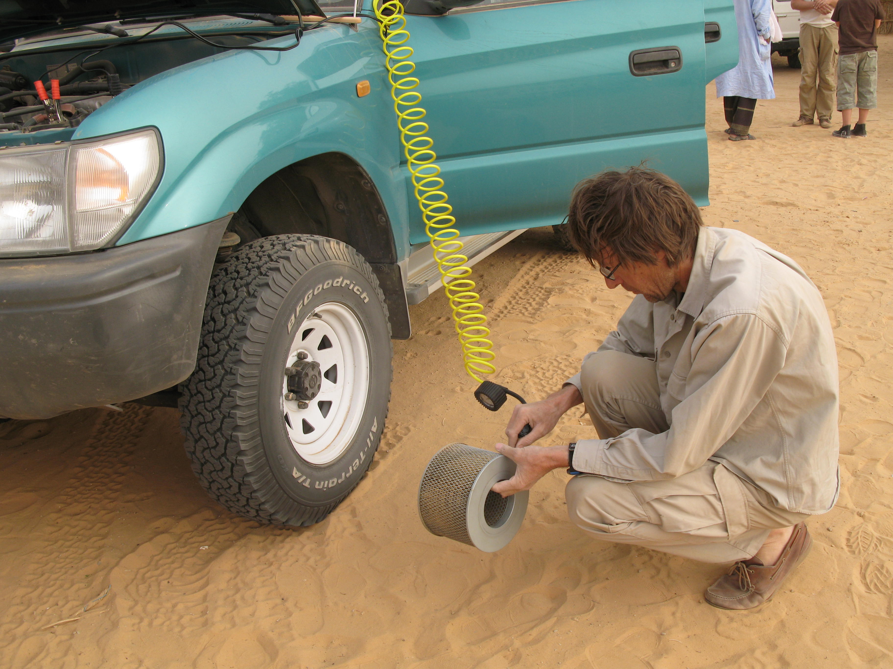 Sur mon Defender, je ne touche a rien pendant le voyage ( sauf si c a fume très noir...), et avant de reprendre la route du retour, je met le filtre neuf que j'avais emporté en pièce de rechange.