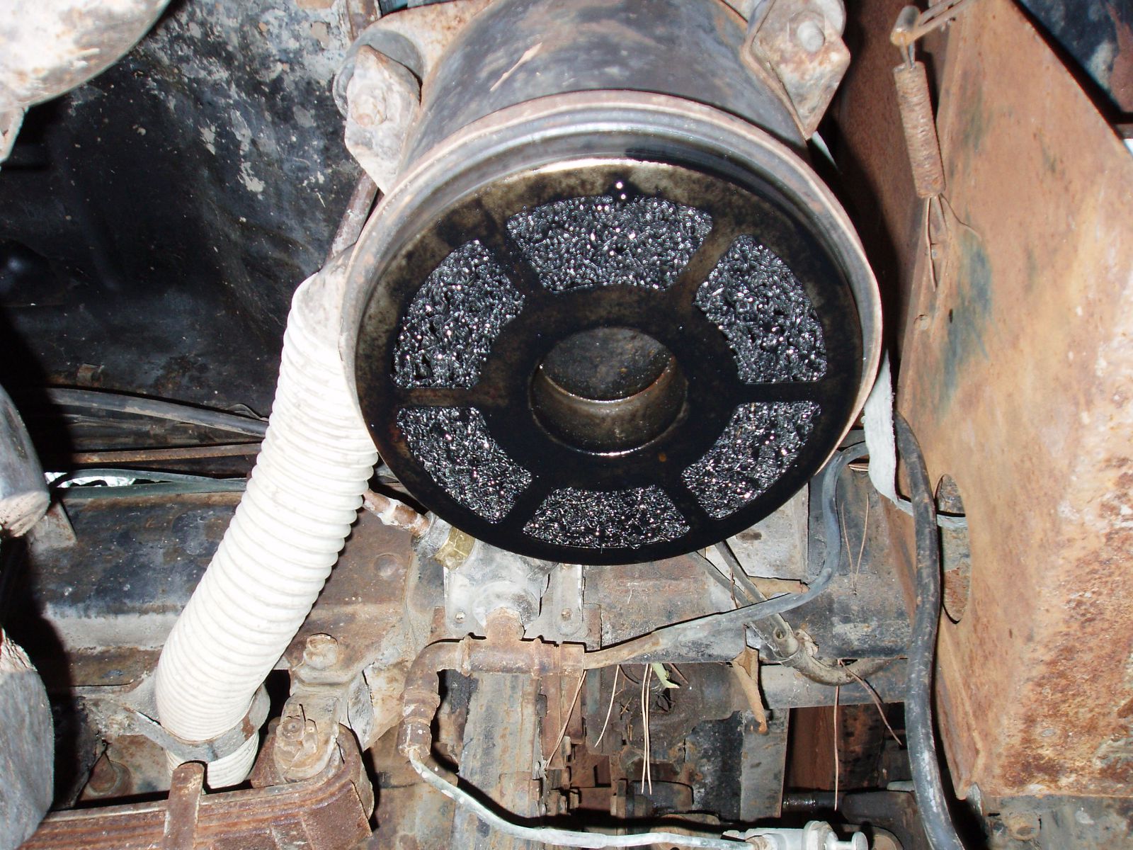 L'air entre en haut par le centre du filtre, descend jusqu'au lit d'huile qui est en bas et remonte par les bords du filtre en passant au travers de la paille de fer.