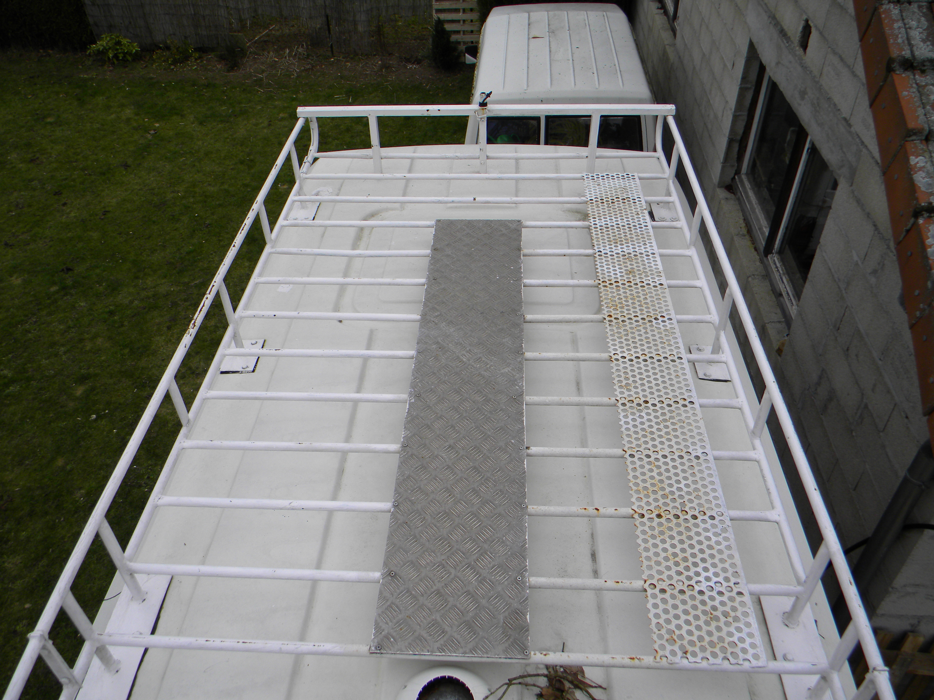 Personnellement je la trouve un poil trop étroite, je pense l'élargir un peu jusqu'à l'aplomb des pattes, virer le chemin central en tôle striée, alléger au max en découpant ce qui ne sert à rien, et poser des planches un peu espacées pour en faire une petite terrasse car j'aime bien me percher là haut et y dormir l'été