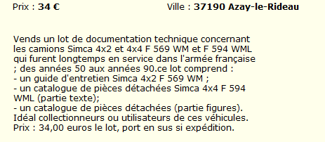 La partie texte c'est bon pour allumer le barbecue, et pis attention les docs militaires, ces catalogues couvrent les pièces pour les Simca 4x4 plateau standart, pour les autres (citerne, dépannage, benne et les 4x2) il y a d'autres catalogues, en général des appendices, bref quand on a toutes les docs il faut le Simca pour les transporter! :lol: