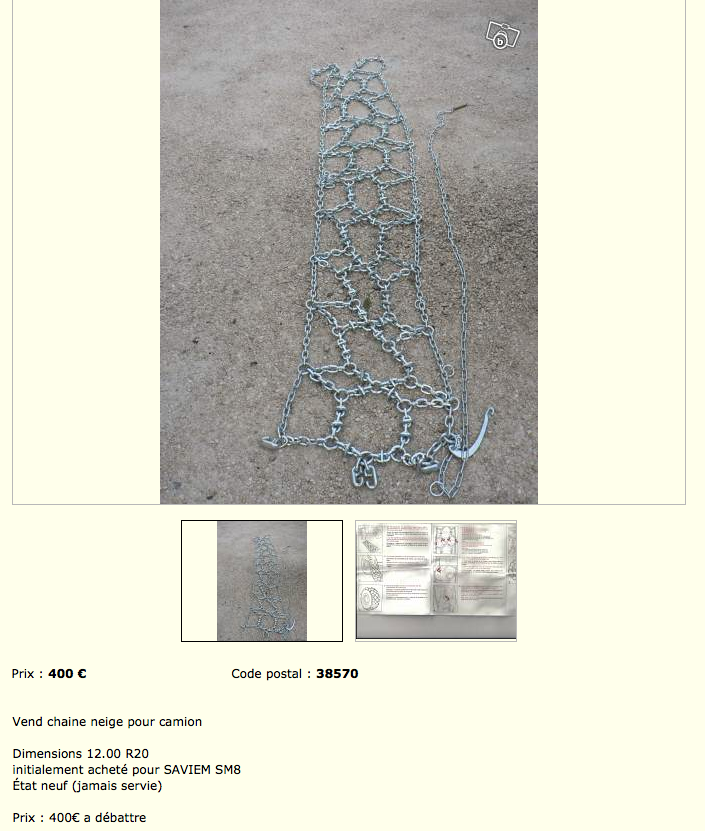 Des bonnes chaines, c'est hors de prix, j'avoue avoir fait une sacrée affaire il y a pas longtemps, 2 paires de Chaines croisillons Rud en 9.00x16 neuves, 30€ la paire