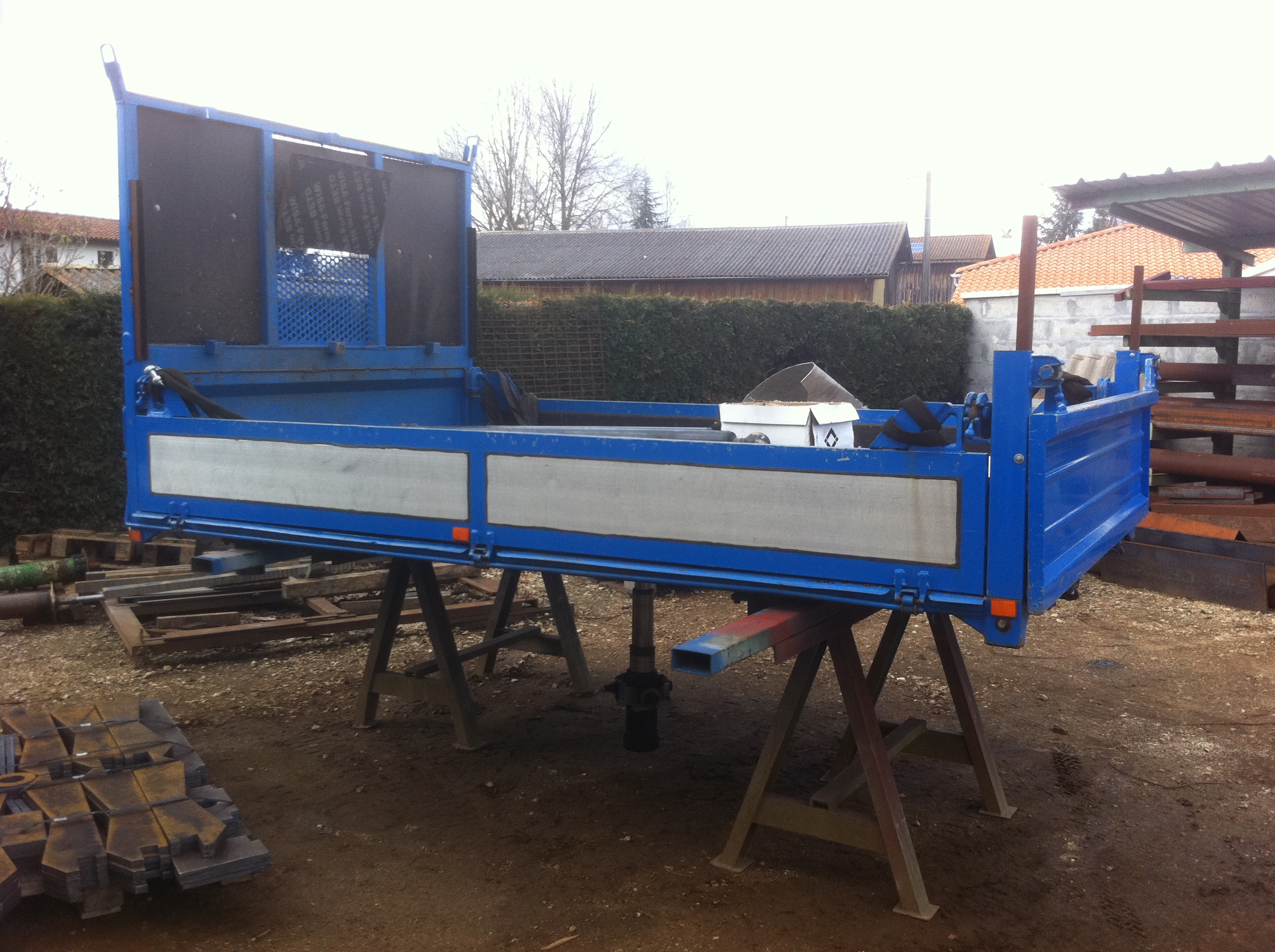 Dépose de la benne (à vendre) pour fabrication du faux châssis à balancier (tout semble en super état !!!) Ma cellule a été raccourcie au niveau de la capucine (qui ne sert qu'au rangement), et un coffre a été construit dessous cette capucine, avec une forme particulière afin de loger une roue de secours supplémentaire. L'ensemble sera bien sur re "gelcoaté" en blanc..... On avance, on avance !!!!