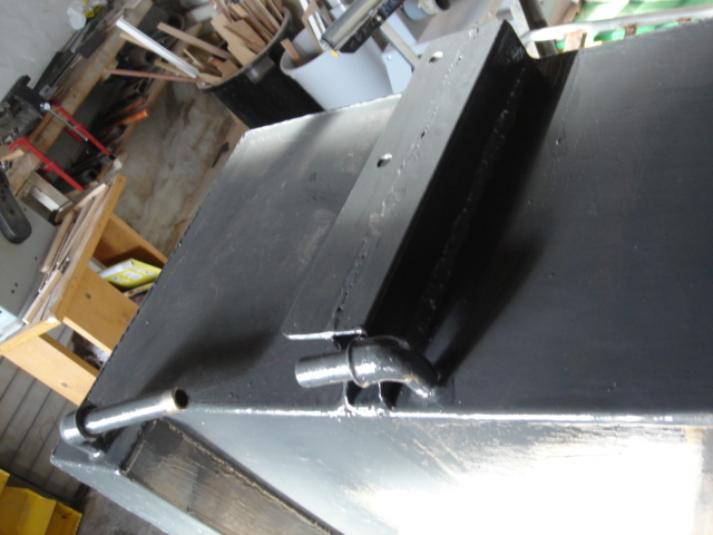 Réservoir en place L'une des ferrures de fixation que j'ai soudées directement sur le réservoir, il y a une cloison soudée à l'intérieur juste à cet endroit. Version "le plombier fou" La trappe et la jauge de gasoil avec les raccordements