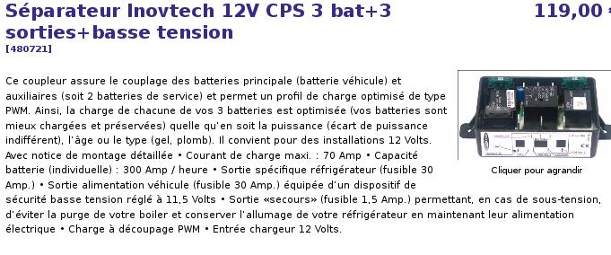 merci je vais regarder, sinon j'ai vu que Victron fait des chargeurs et convertisseur avec maintien de la charge du porteur quand branché sur le secteur. C'est pas ce que je recherchais mais pour les periodes d'hivernage c'est intéressant car cela permet en plus d'économiser de l'espace dans le meuble elec. Mais si il y a une panne on perd 2 fonctions d'un coup ~~ . Si vous avez un avis la dessus.Bsansvin wrote: 05 Sep 2024 11:03Oui le Cyrix de chez Victron avec la fonction "Start Assist"bext wrote: 04 Sep 2024 14:53 Quelqu'un aurait il un montage qui permettrait de recharger sa batterie porteur depuis l'aux ponctuellement ?