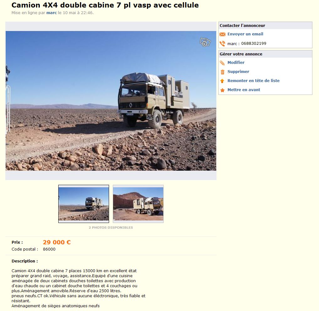 je mets l'annonce en relais ici... c'est celui d'un ami qui nous a emener au maroc cet hiver... c'est un super camion même si la cellule n'a pas été pensée pour dormir dedans... (deux douches, deux chiottes et une cuisine plus 3000 litres de flotte)... c'est hyper agréable sur piste par contre il est glouton je crois..