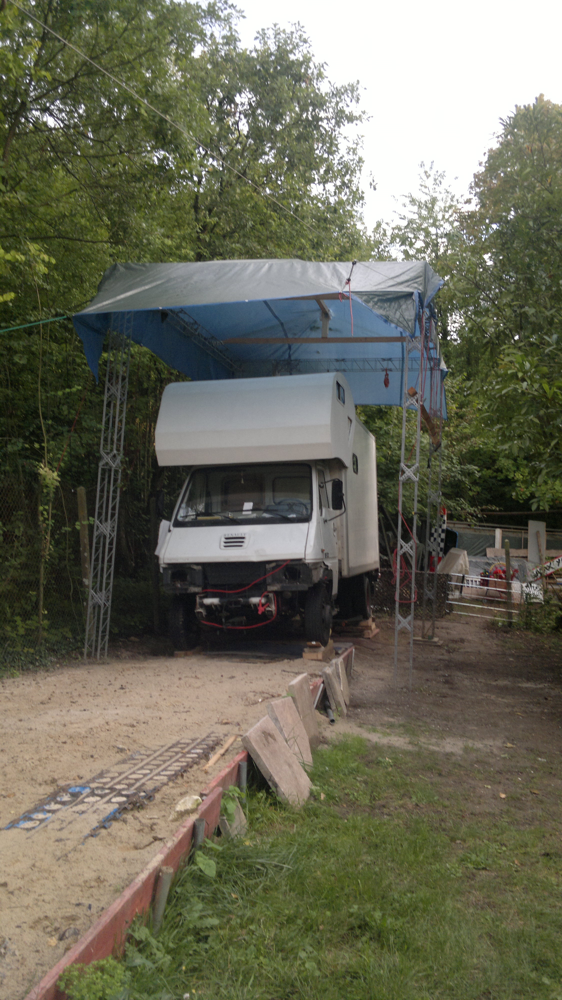 2010 deux jours avant de partir en vacance je décide de décapité la capucine pour lui donné forme arrondie car le toit avais pourrie (grosse erreur de ma part d'avoir acheté ce camion avec cette capucine faite a la va vite sans résine, mais j'était plus jeune^^)