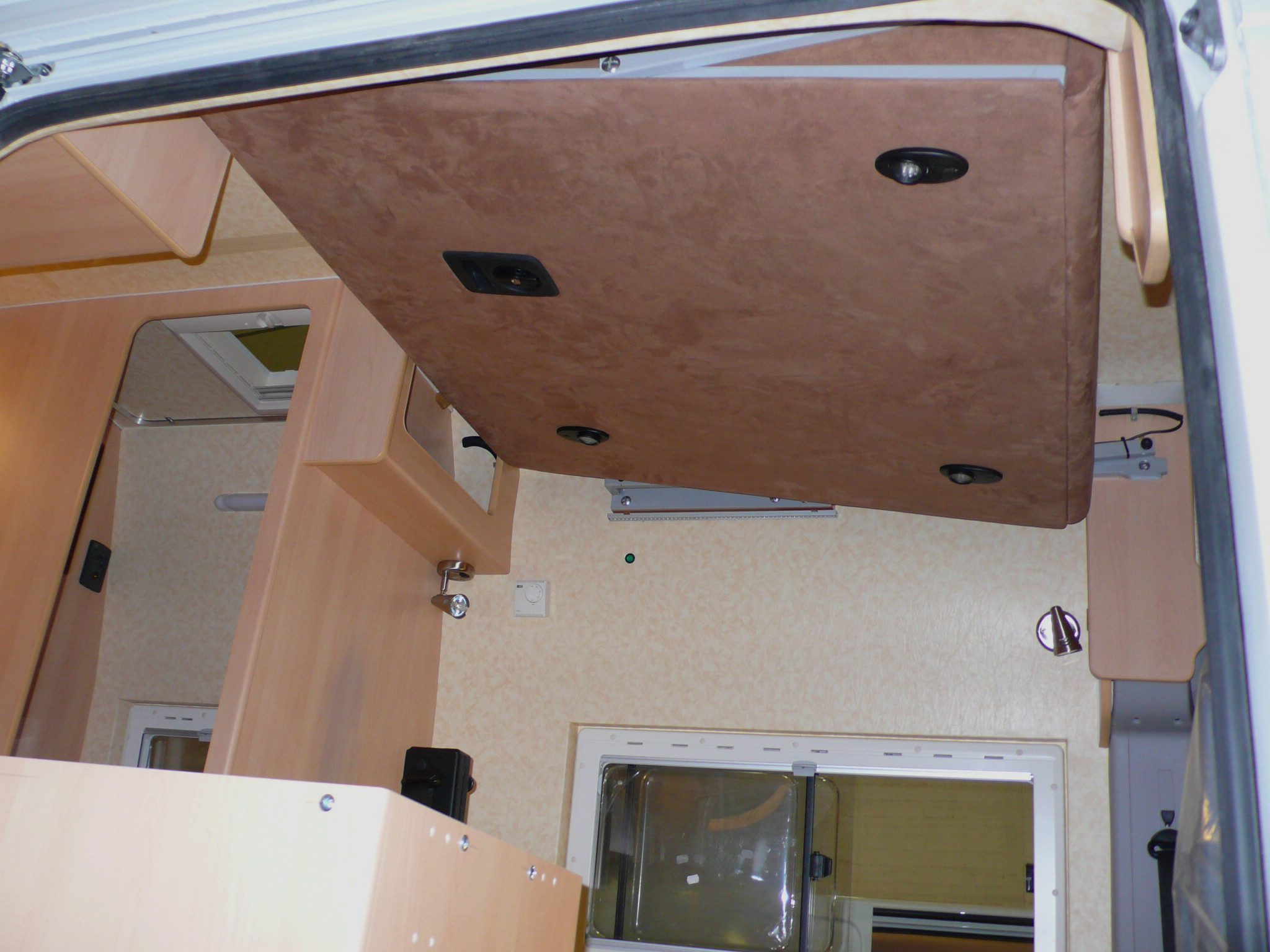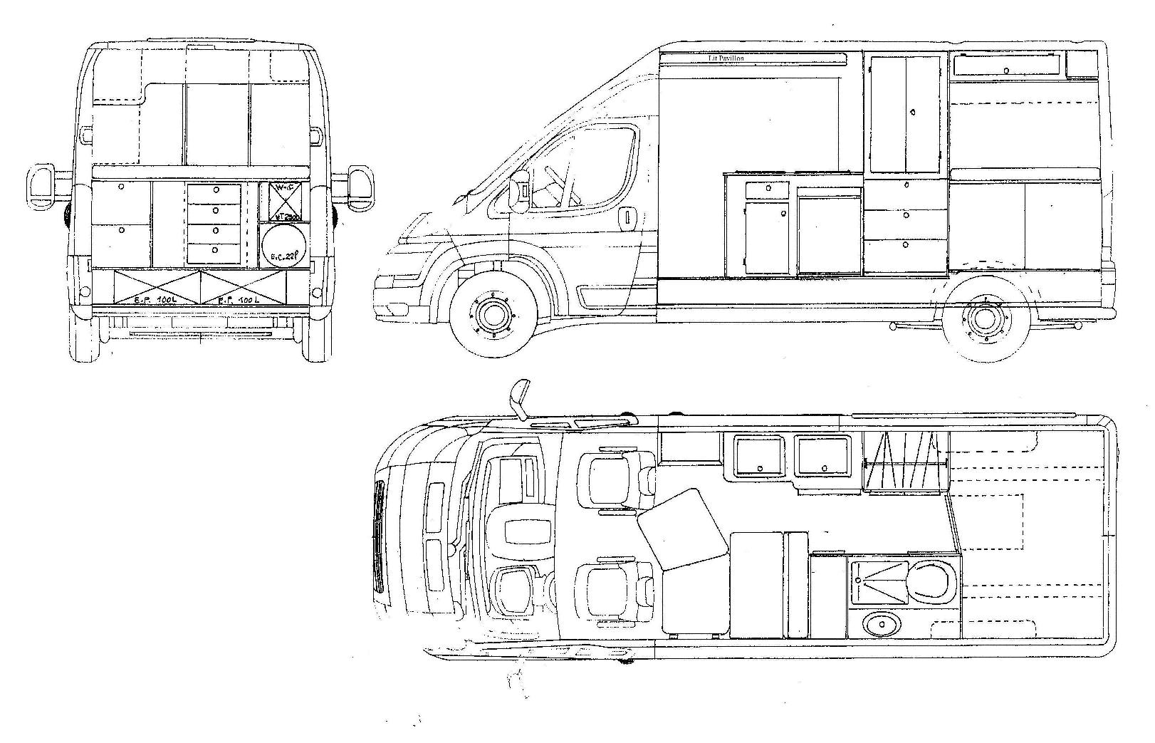 On a passé des plans a l'amenageur, il a mis sa touche, et ca a donné ca: Voila les vues d’ensemble de la bête. Bienvenue a bord A table Les places passager (4 places CG). La salle de bain et les rangements pour Madame. Lit permanent pour les enfants, avec lanterneau d’accès au toit, pour regarder les animaux et l’accès aux panneaux solaires. Dodo pour les parents. Le lit ne tenait pas dans la longueur, alors on a retenu un télescopique. Un peu plus de travail au dépliage mais ça reste raisonnable. Et les draps/matelas restent dessus même en position haute.