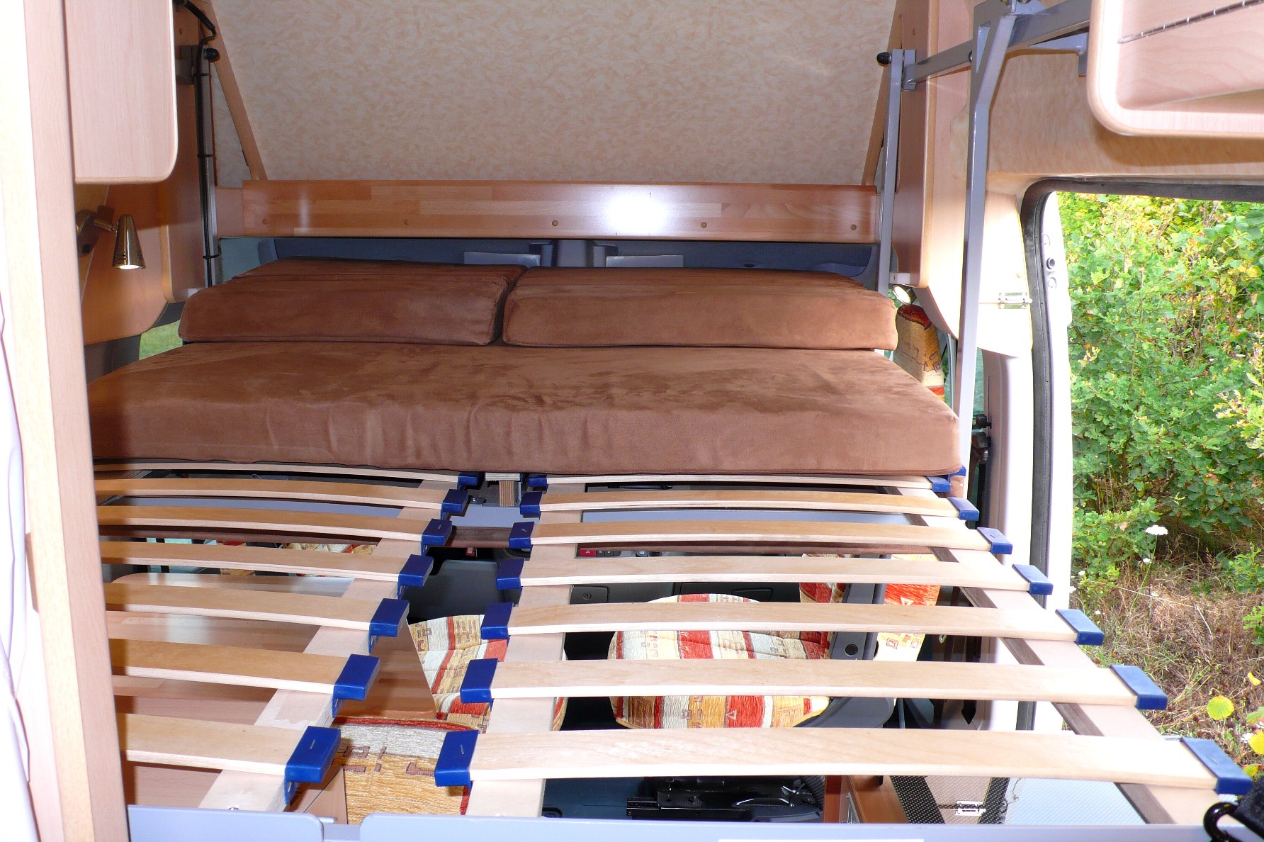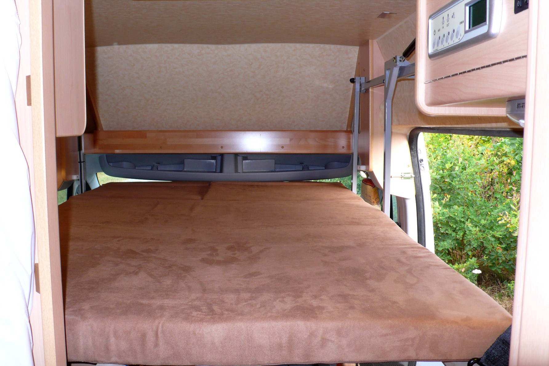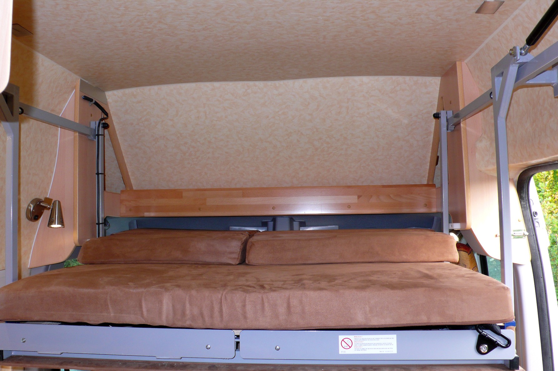 Position haute Position basse replié, Déplié Lit fait A priori, on est contents de l’aménagement, et les retours qu’on a disent que c’est du solide (Et oui! Les motifs de tissus d'un Iveco a vendre nous ont semblés familiers, Merci Guy pour le retour d'info