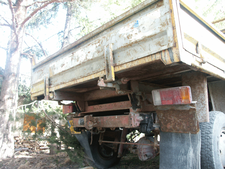 Pas simple, et pas si dur! Ca ne roulle pas encore, mais demain, appres une purge d'étrier de frein gauche, ça devrait aller. C'est tout remonté. coût de l'opération une trentaine d'heures pour moi, 24h pour John. Qui est venu m'aider, c'est a dire 450 euros. 2000 pour le vert, qui est finallement bien rouillé en dessous, mais pas si sale. Comparé avec le jaune qui lui est moins kilométré, mais n'a pas êté entretenu dessous, et est mangé bouffé par la rouille. Celui la m'a couté 2500 euros sans CG. Mais il avait des cardans et un pont en à peu pres bon état. Et tout le reste qui a 101mkm. Une prise de force hydraulique sur boite de vitesse aussi. J'hérite a vendre, d'une benne et quelques pièces attenantes. J'vais ptet fourguer un peu de tolerie, genre protection avant, réservoir et quelques conneries dans le genre. Si la benne ne part pas, j'en fait une remorque ou une grue