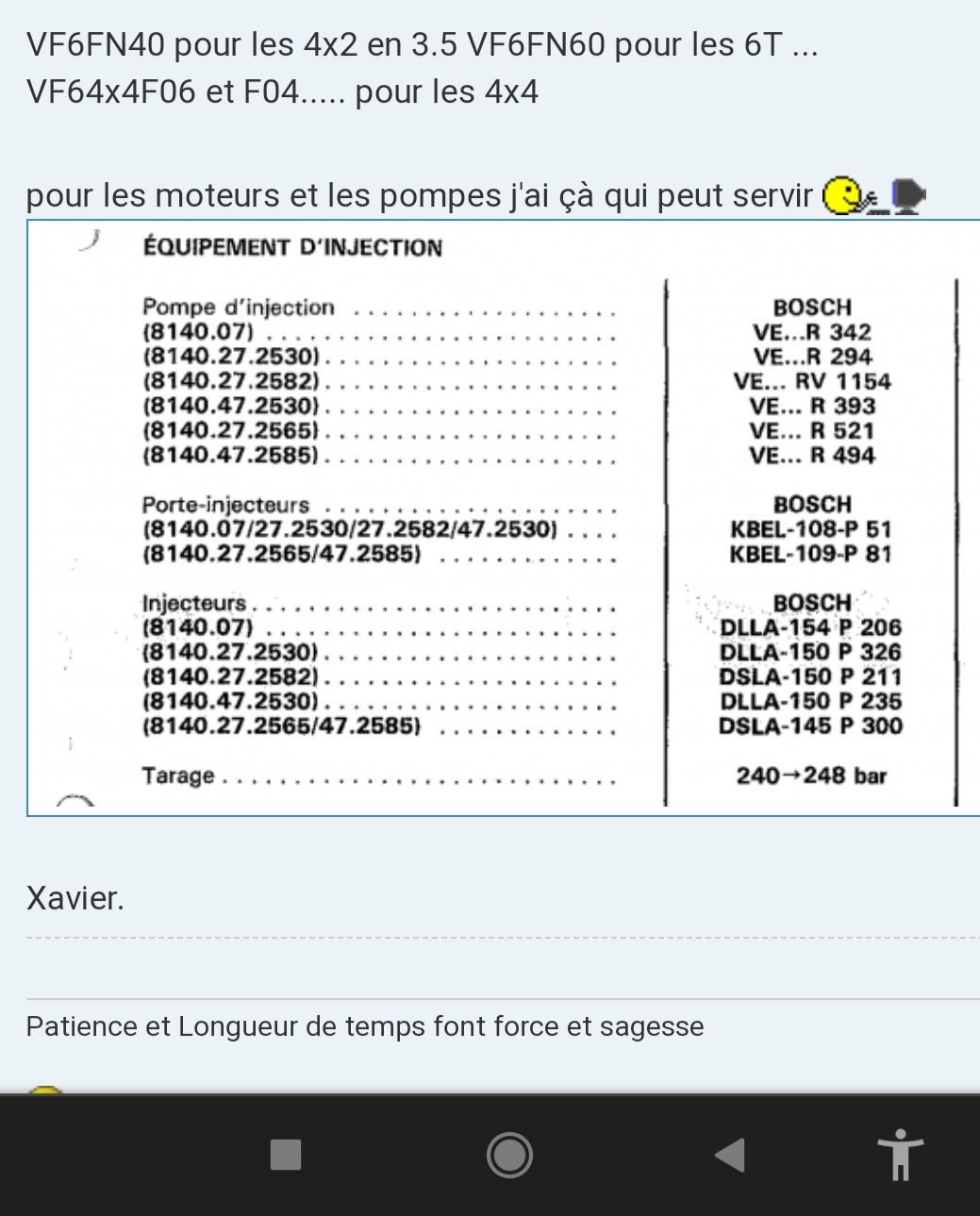 Pour ceux qui cherchent les valeurs nécessaires pour comparer les différentes injections entre les B,je remet les documents en question. Mon model étant pour un moteur 8140-27 2,5l B110 106cv, transformé en B120 avec les valeurs (pour la pompe à injection) du moteur 8140-47 2,5L/116CV.