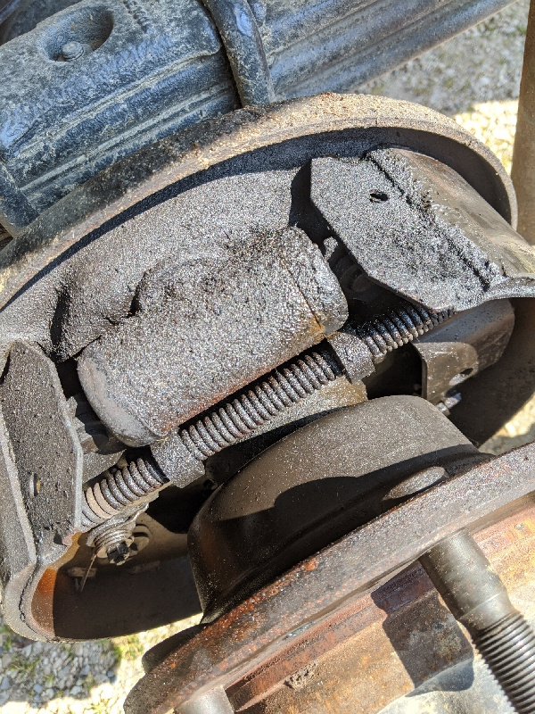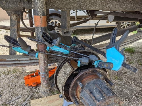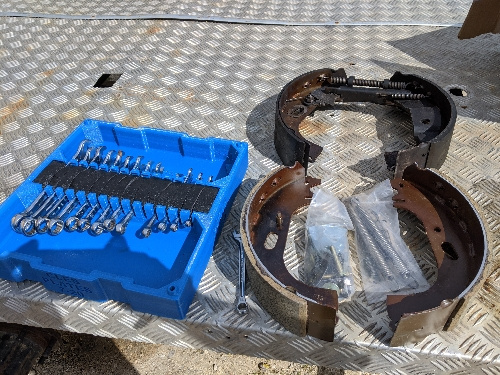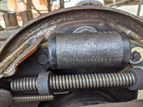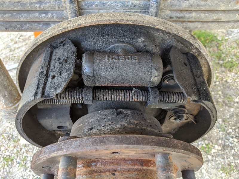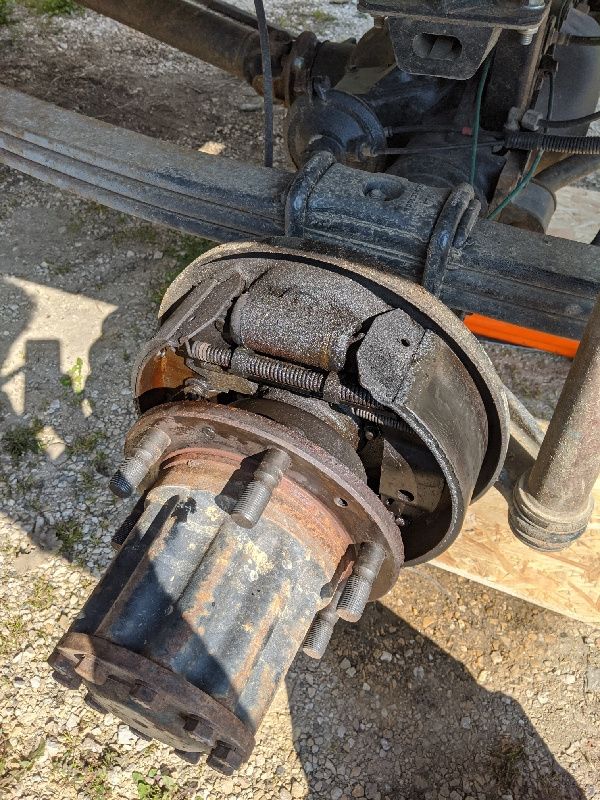 Avant cet exploit, mes tentatives précédente on perforé les cache poussière du cylindre de roue... Bref pas fier du résultat. Et une fois le tambour en place, pas moyen de tourné l'essieu a la main !!! J'y arrive en coinçant un pied de biche entre les goujons de roue. Ça frote, mais ça ne force pas trop...