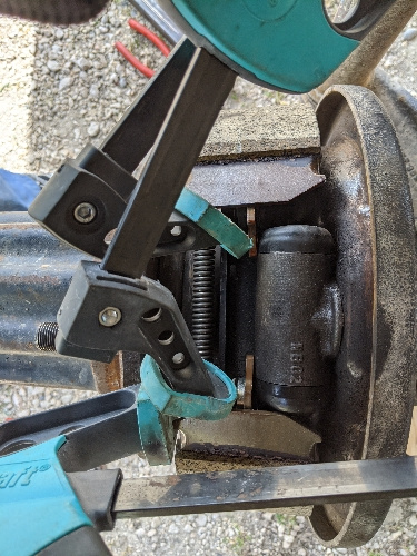 J'ai un serre joint qui tire une garniture et l'autre qui pousse la deuxième. Pour les deux, je prend appuis sur l'amortisseur... Le troisième serre joint sert a évité que celui qui pousse ne rippe... Il est entre la garniture et les lames de suspension...