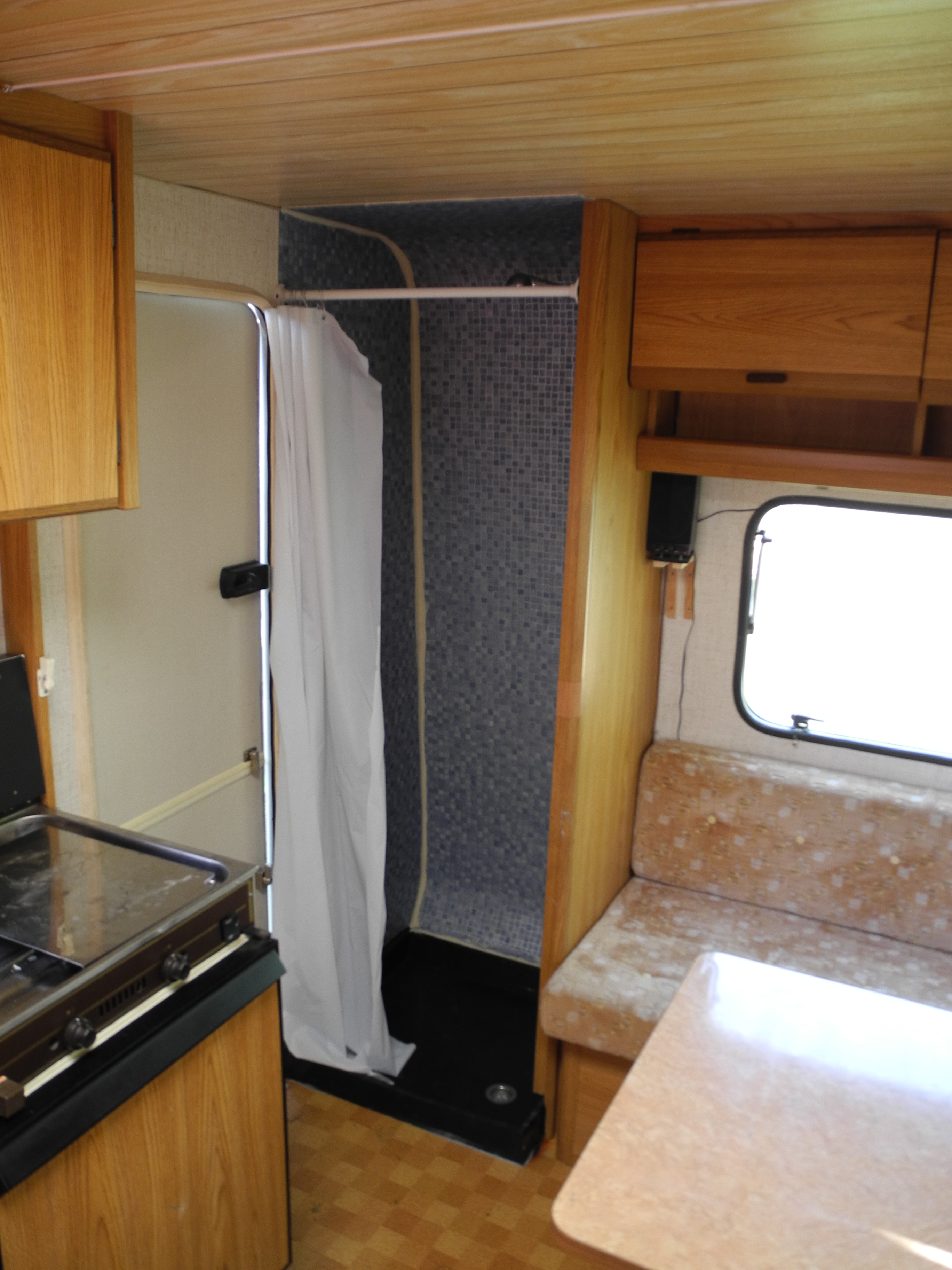 voila le douche,qui est a la place d'une penderie, j'ai fait le bac dans de la plaque pvc de 10mm d'ep, les coter on été coupé puis souder au decapeur thermique.....