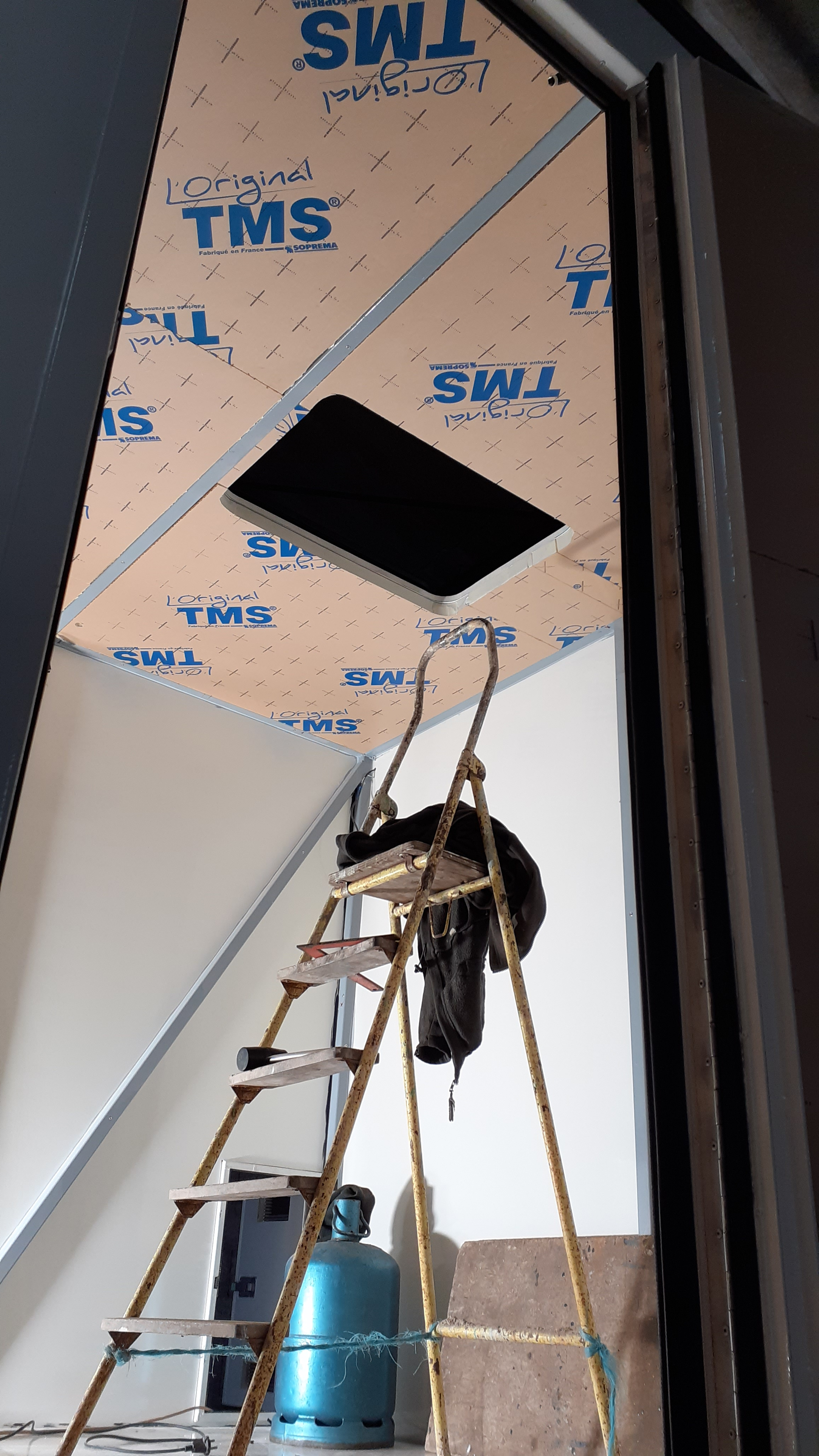 Du coup toutes les fenêtres et lanterneaux ne peuvent être posés tels quels sans compenser la surépaisseur par les "rallonges" en alu cintré. Je pense peindre en noir après jointoiement.