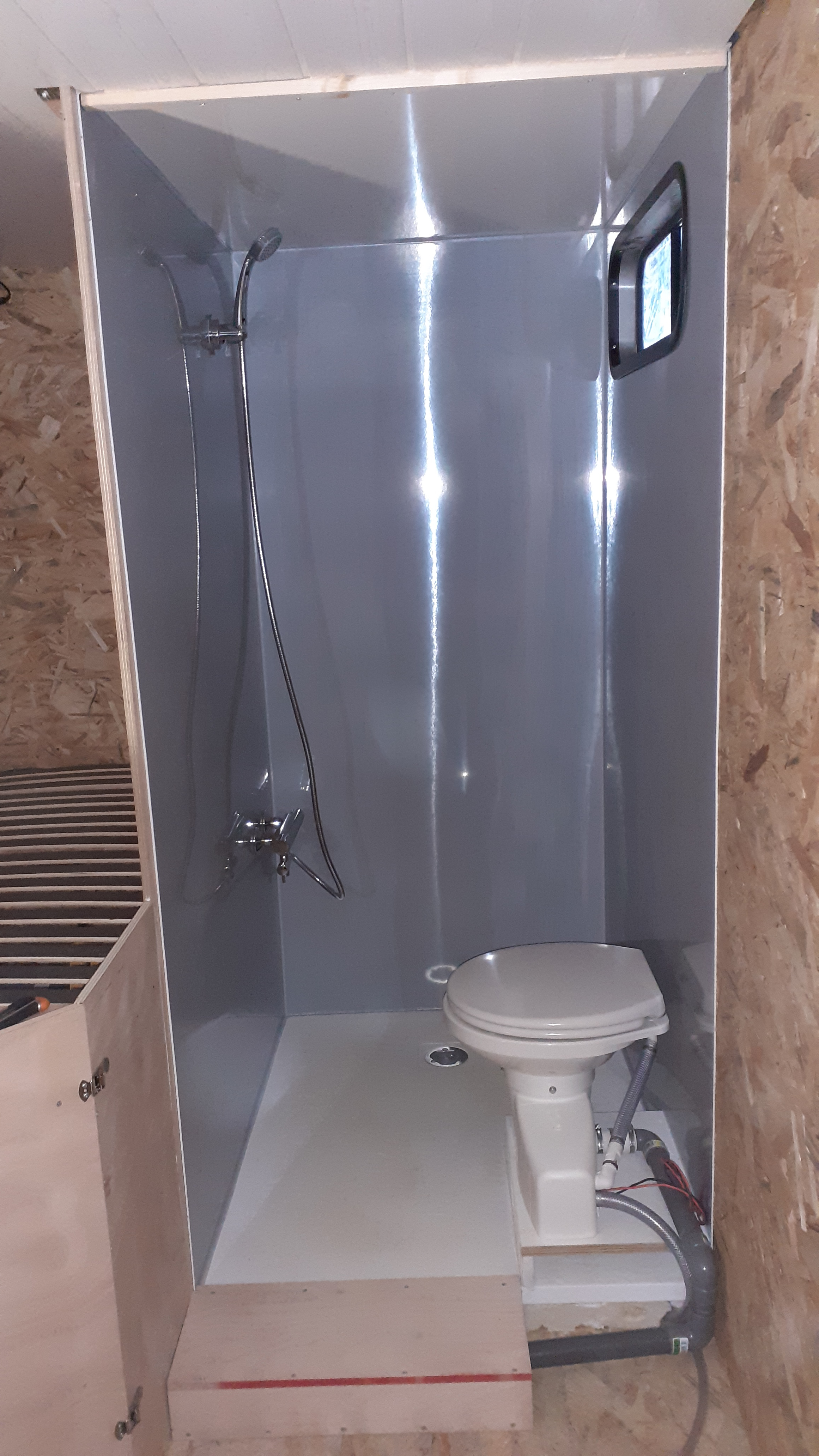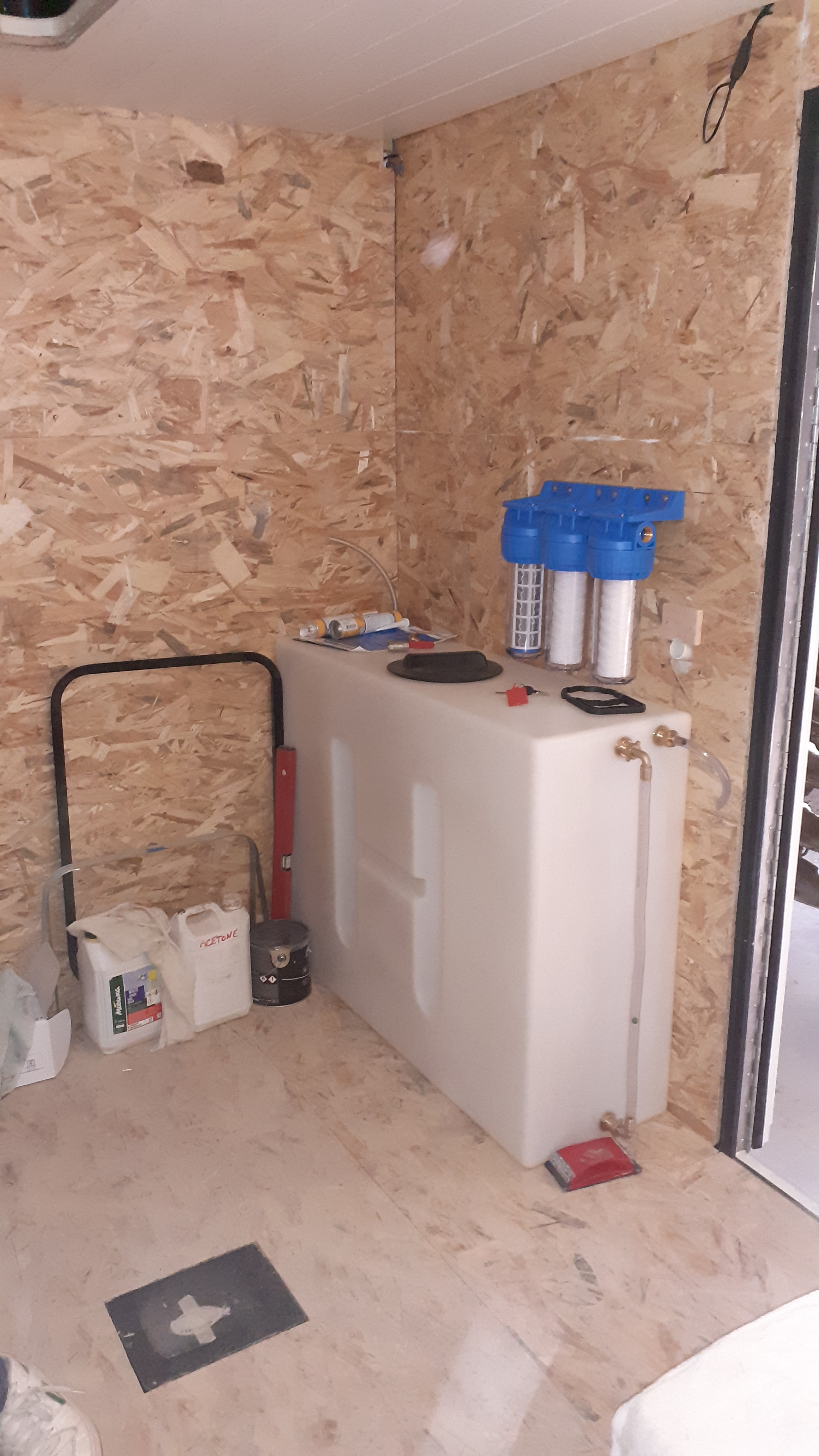 Ce matin on a rentré le receveur de douche, le sommier, le frigo et le réservoir d'eau propre. Juste histoire de jouer au tetris et de se projeter :D