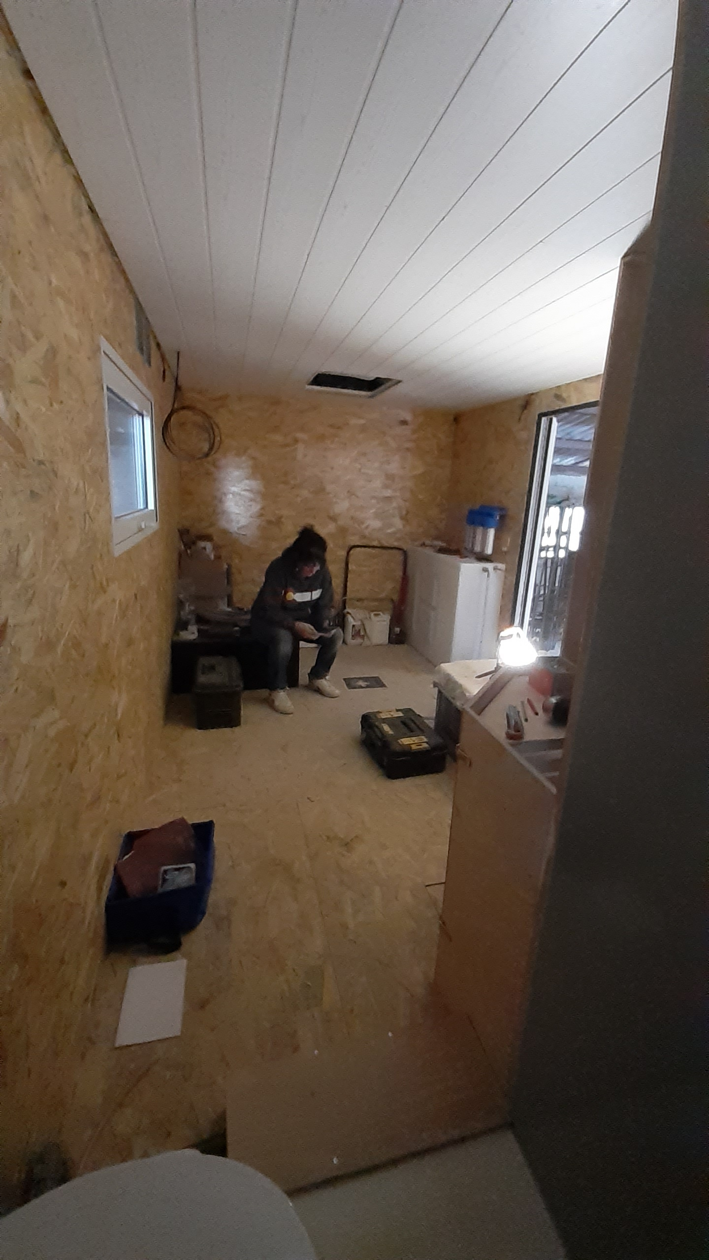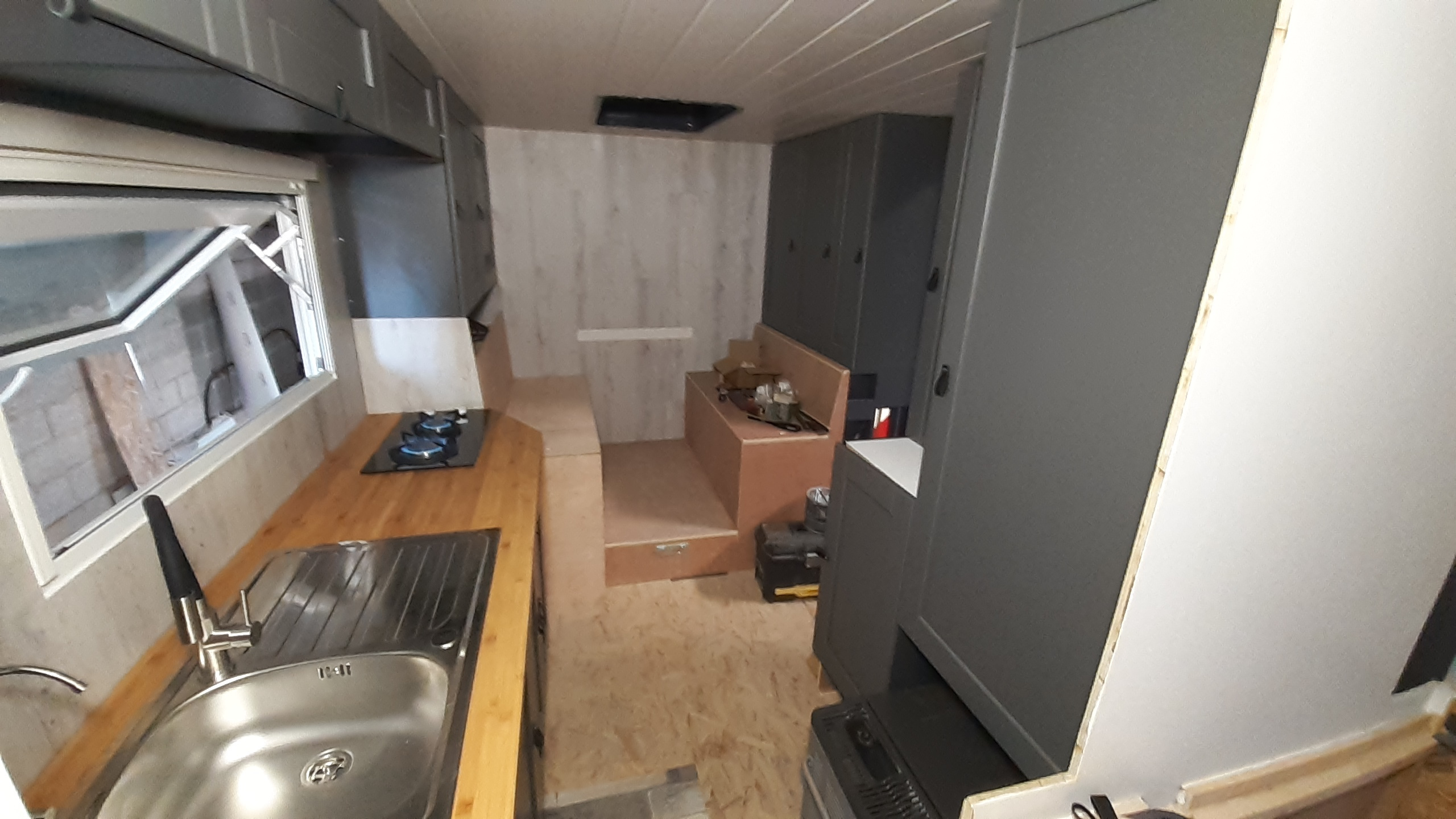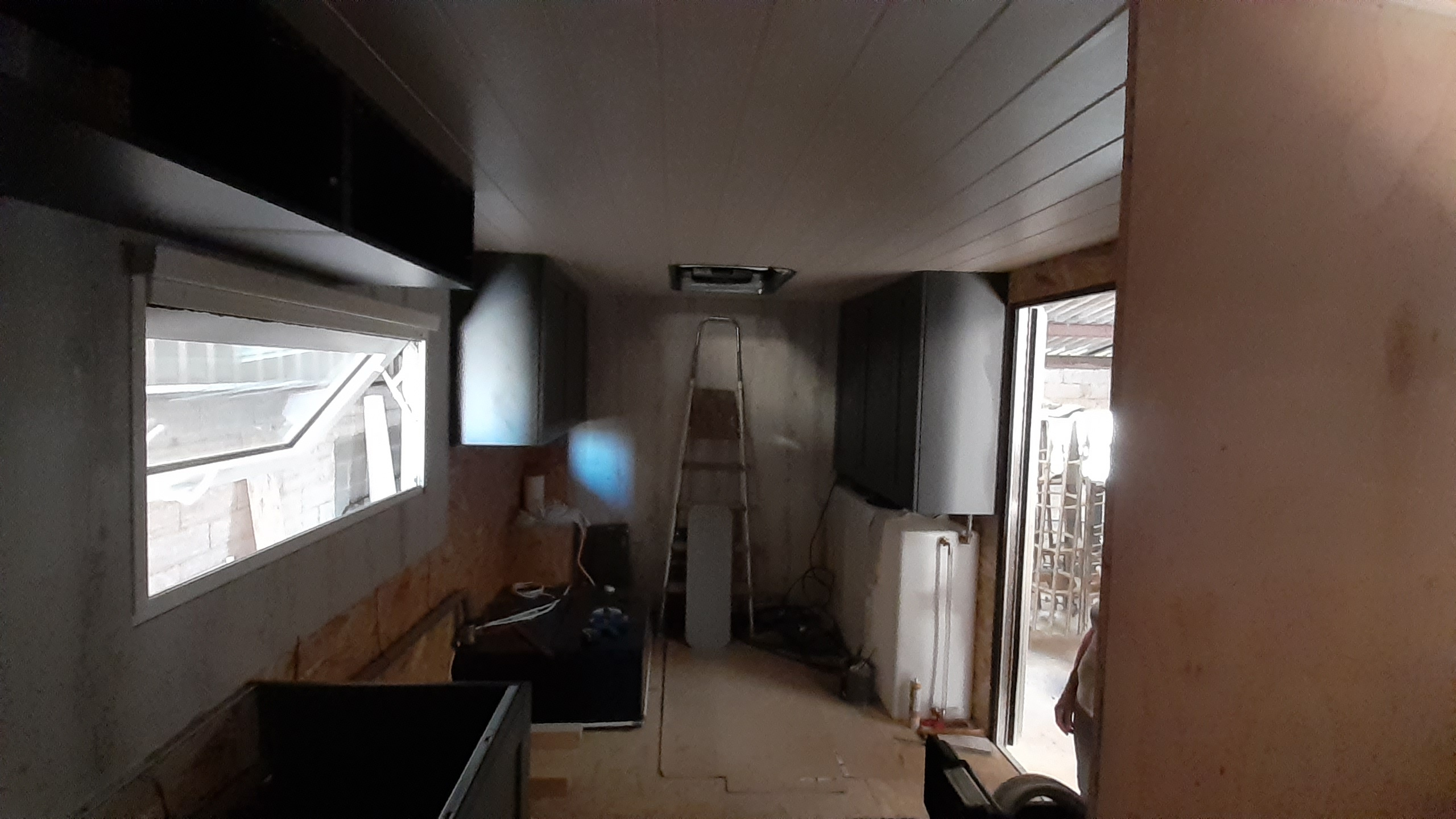 Plafond posé, salle de bain faite à 75%, coin couchage fait.