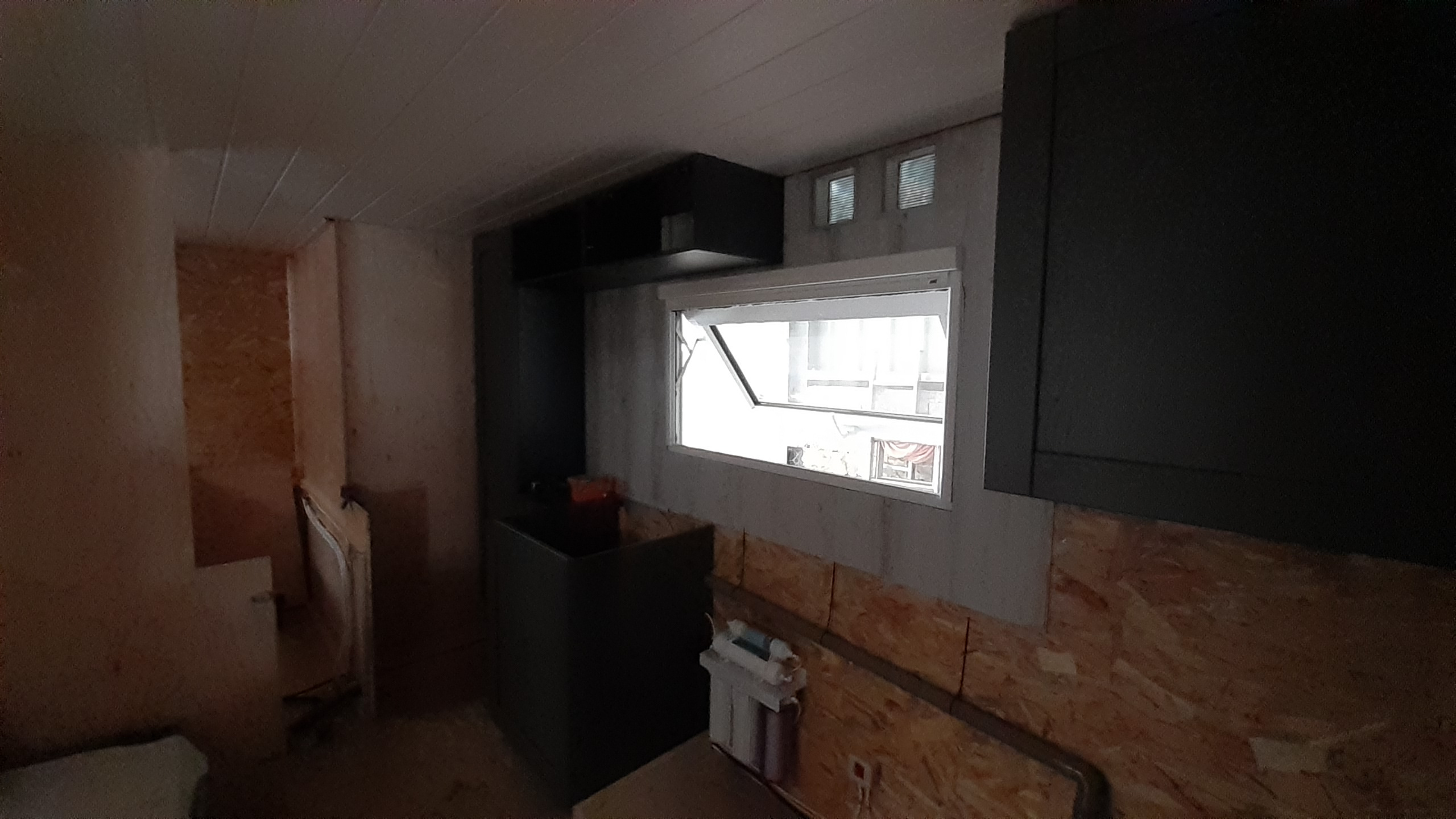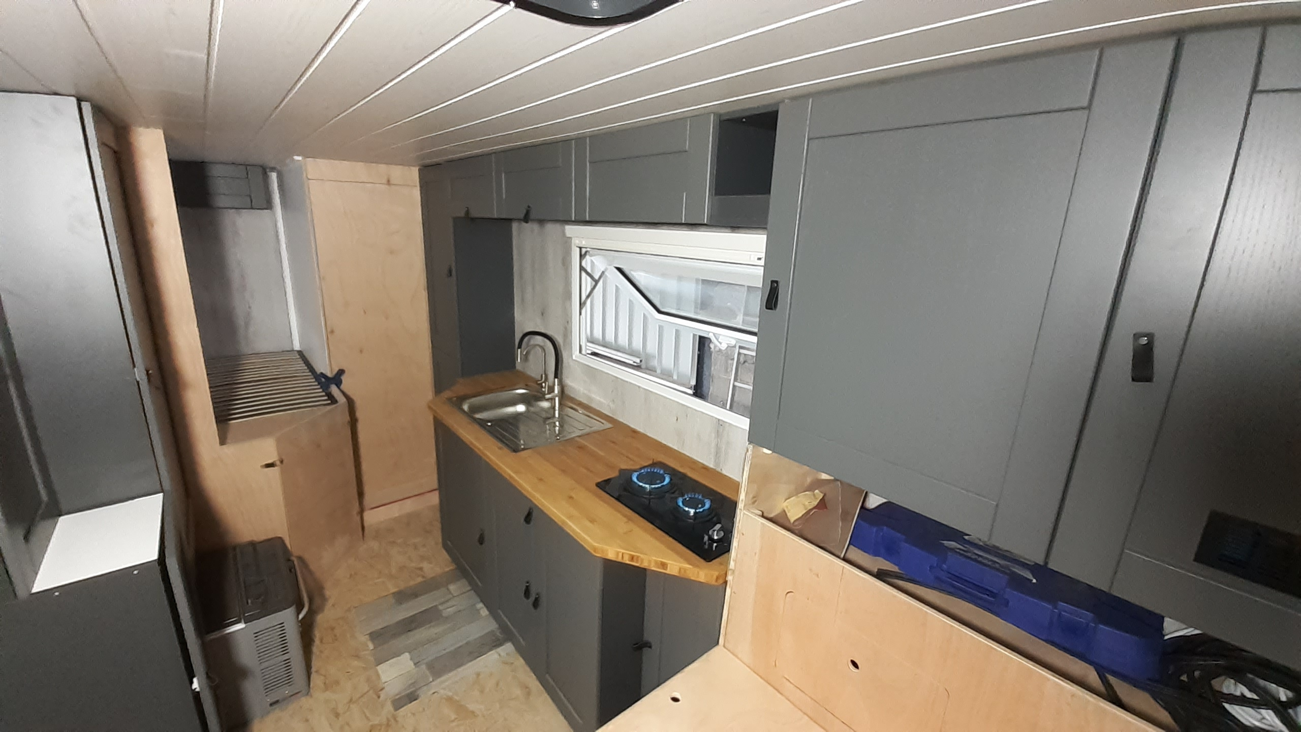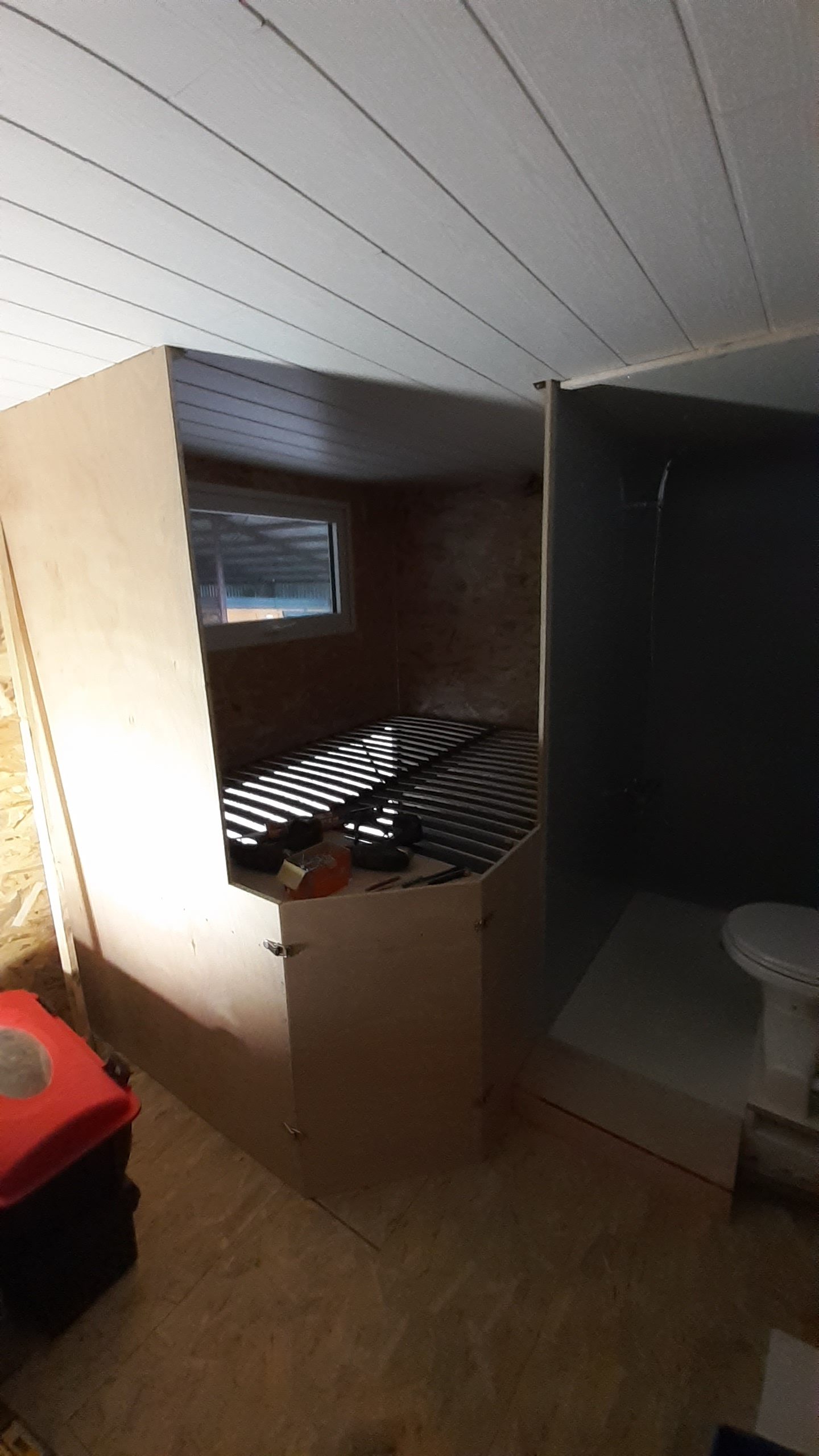 Plafond posé, salle de bain faite à 75%, coin couchage fait.