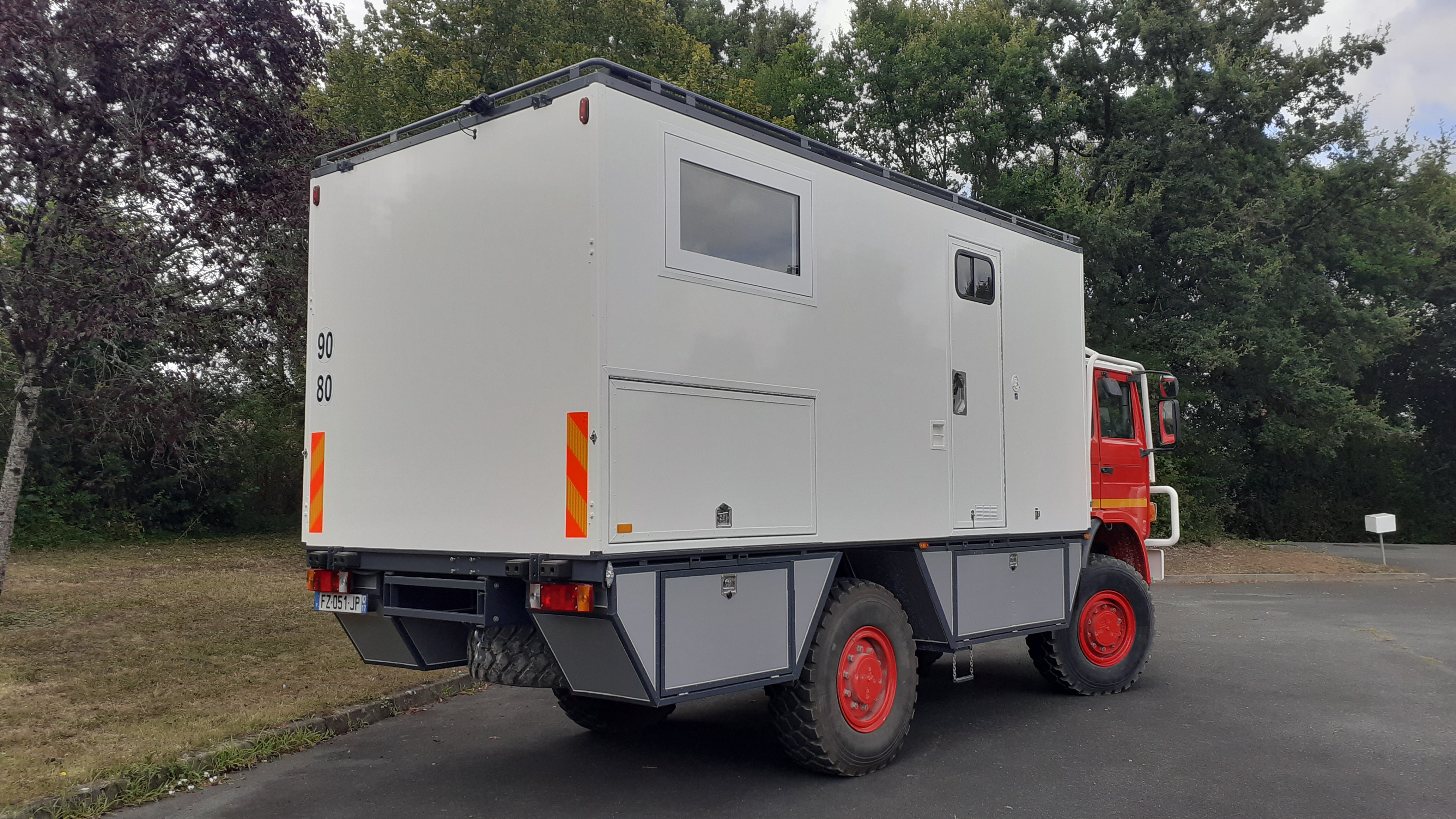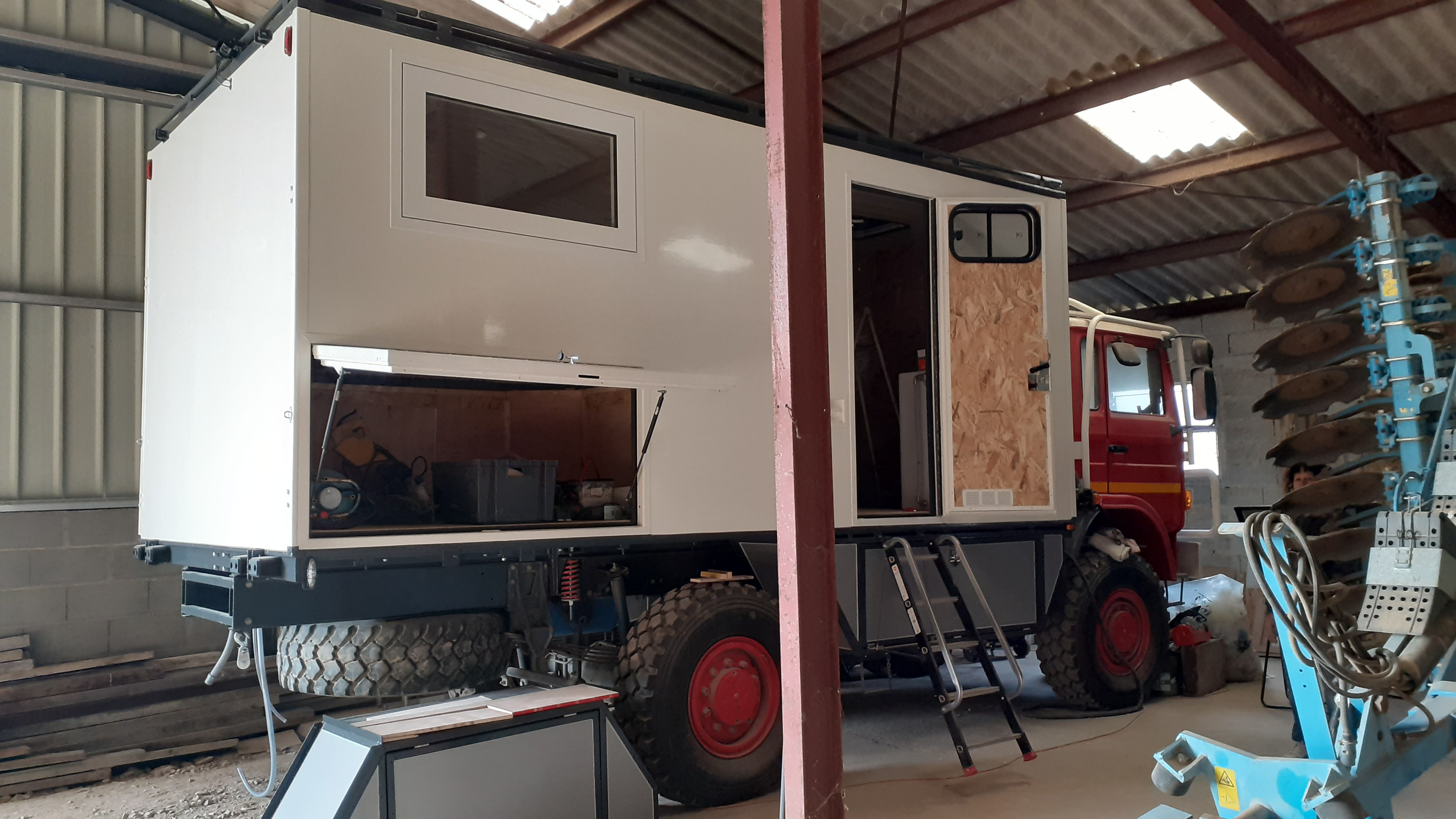 Porte à faux augmenté aux 2/3 de l'empattement avec l'autorisation de Renault Trucks. Oui ça commence à faire beaucoup 2.26 de PAF pour 3.40 d'empattement , il faudra être vigilent dans les virages serrés / aux feux / pendant les manoeuvres.