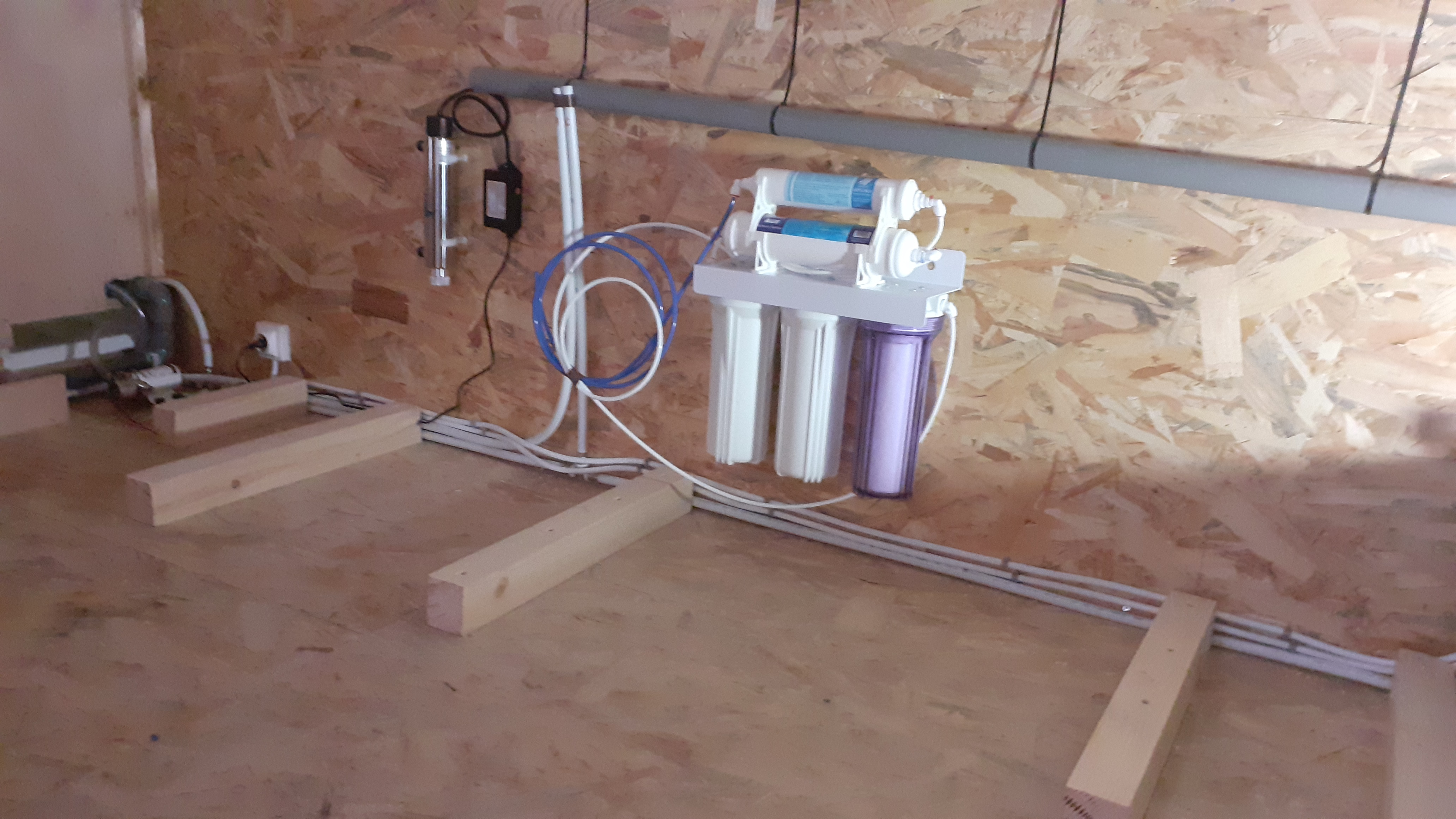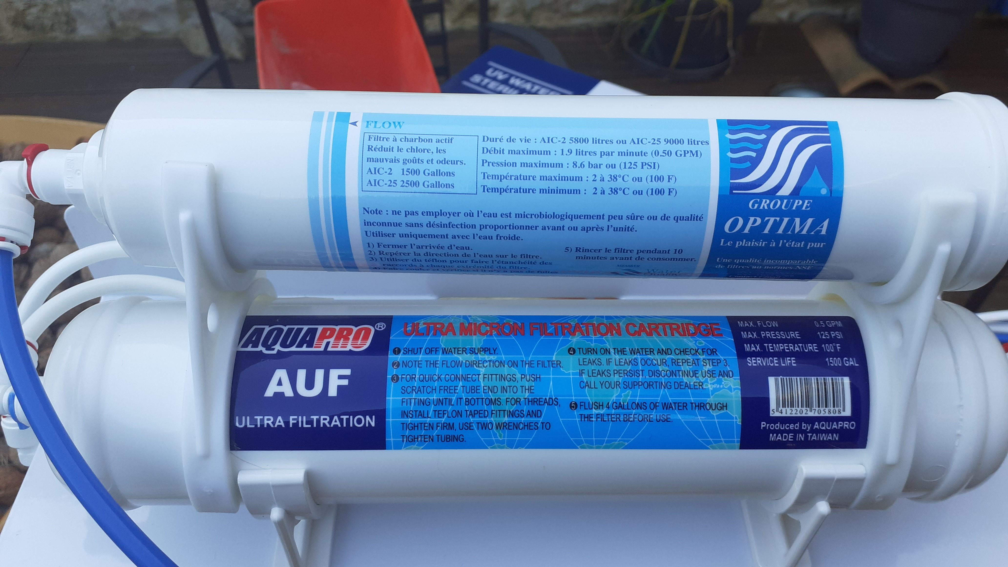 Ultrafiltration pour l'eau potable (un pissette à côté du robinet de l'évier) à 0.01 micron + filtre à charbon actif et traitement lampe UV en 220V.