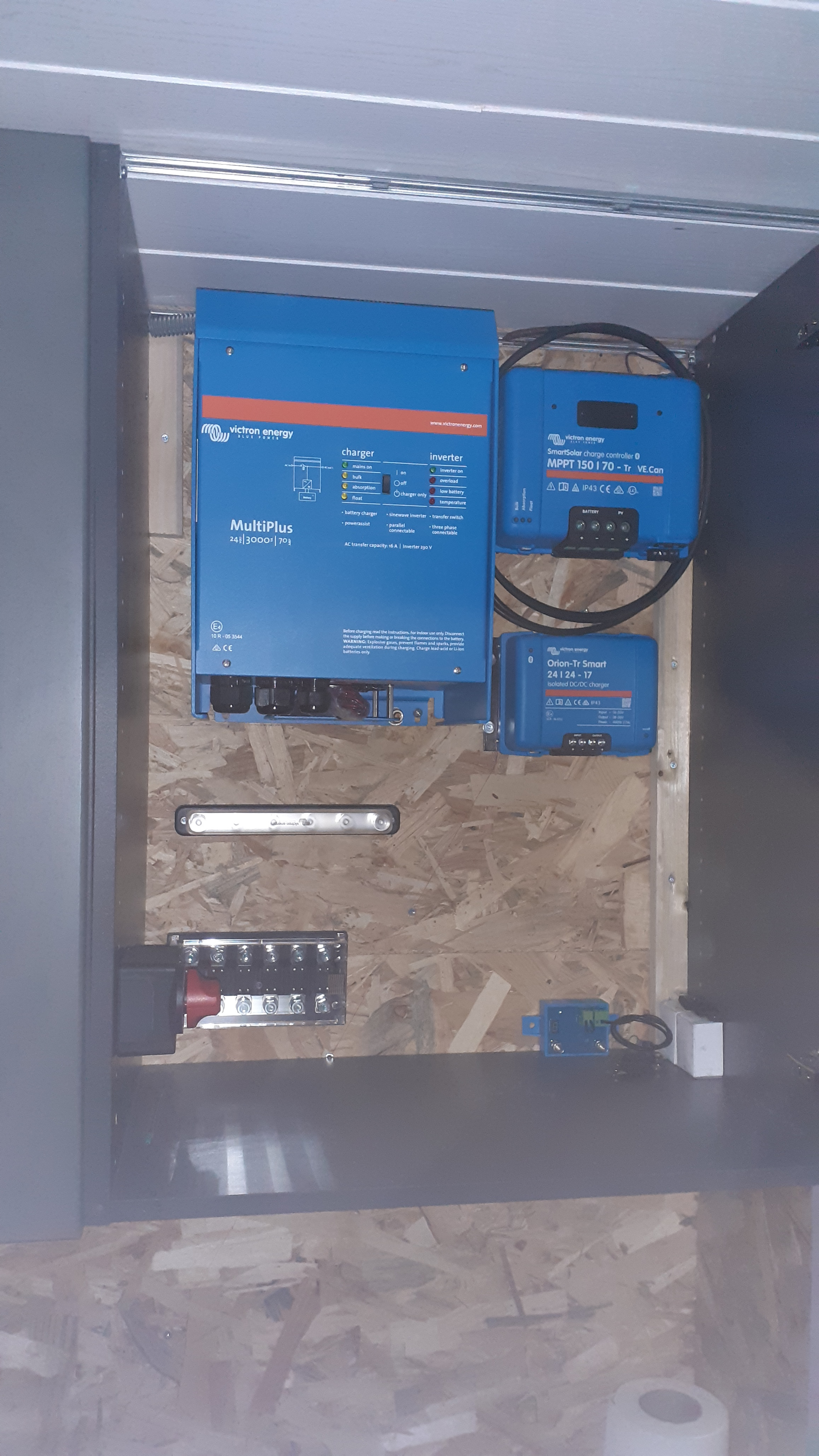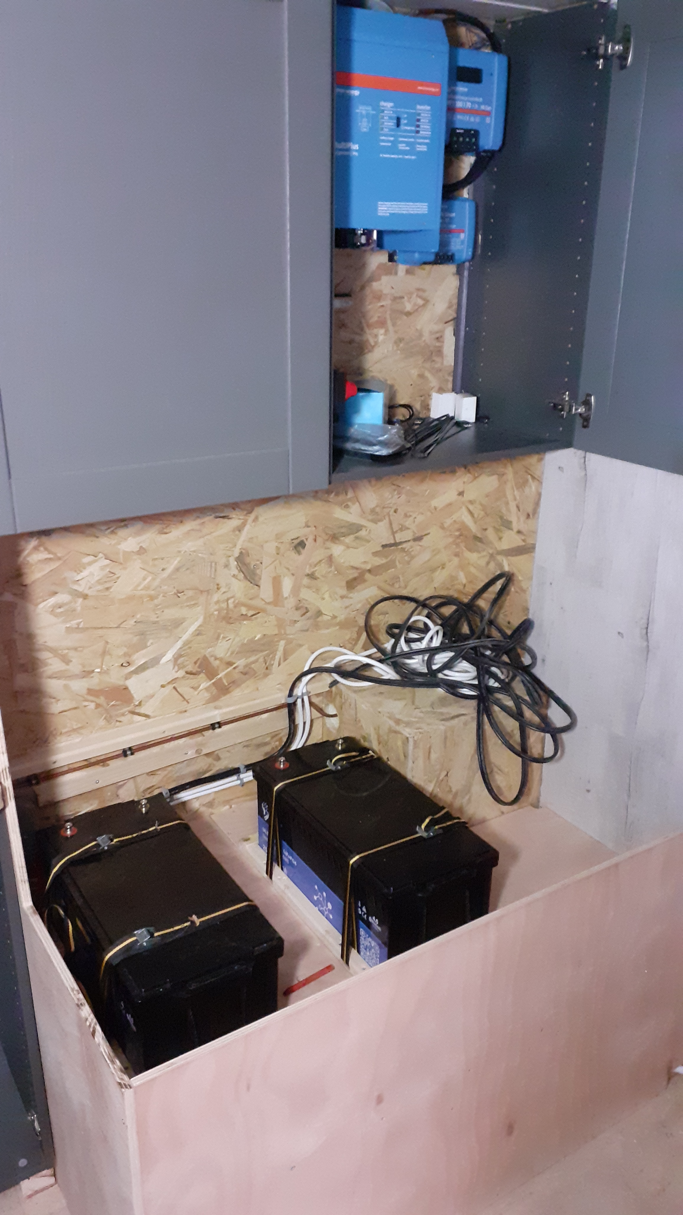 Armoire électrique dans un meuble de cuisine. J'ajouterai des ventilations. Un peu serré, je dois ajouter le tableau 230V ( 8 modules ) et qques bricoles. Au besoin j'en déplacerai une partie dans le caisson attenant.