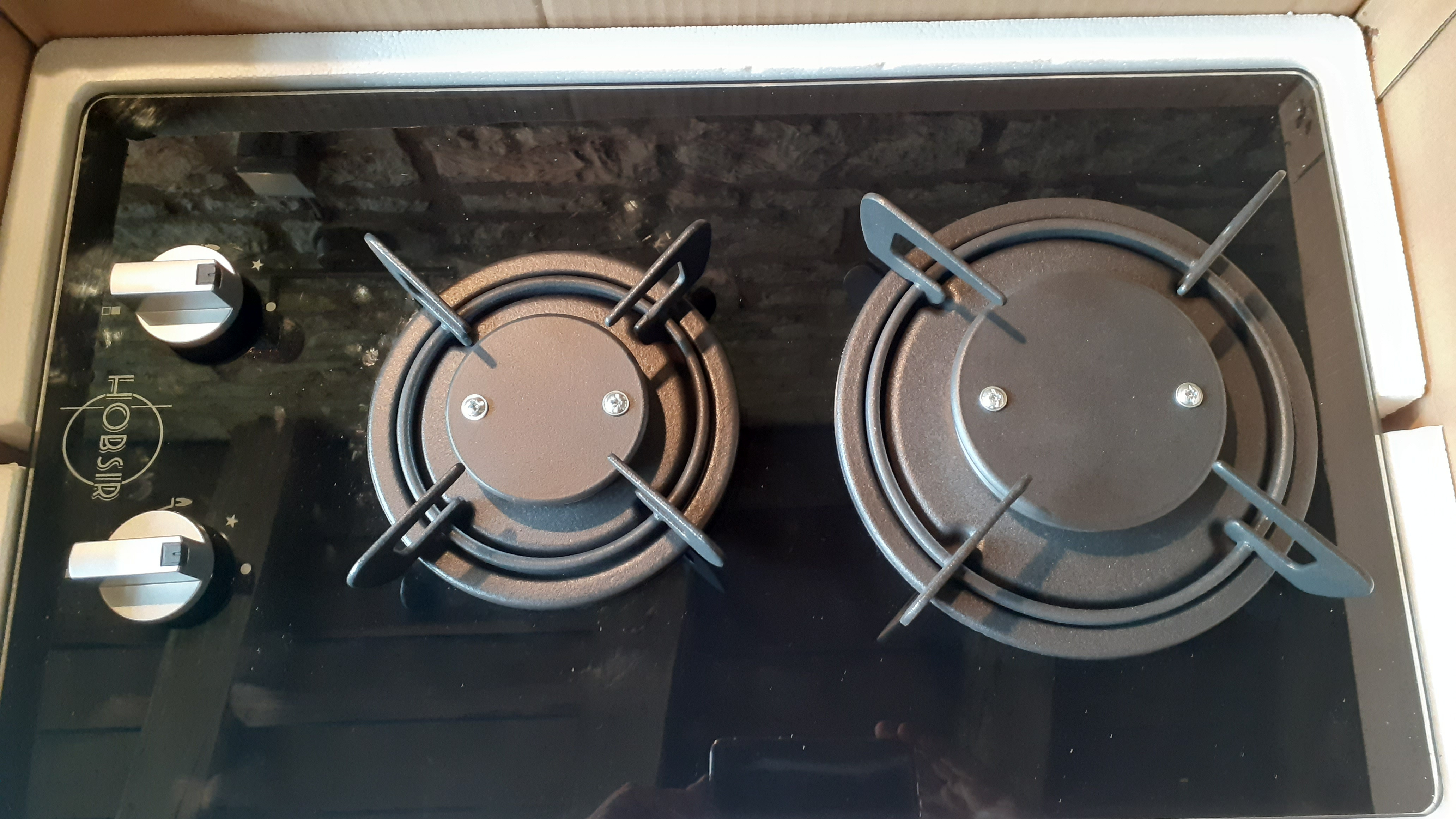 Gaz posé. Plaque de cuisson domestique modifiée pour homologation VASP (chapeau fixés avec solution maison, vu et accepté par Qualigaz). Les thermocouples sont impératifs mais montés d'origine sur le produit.