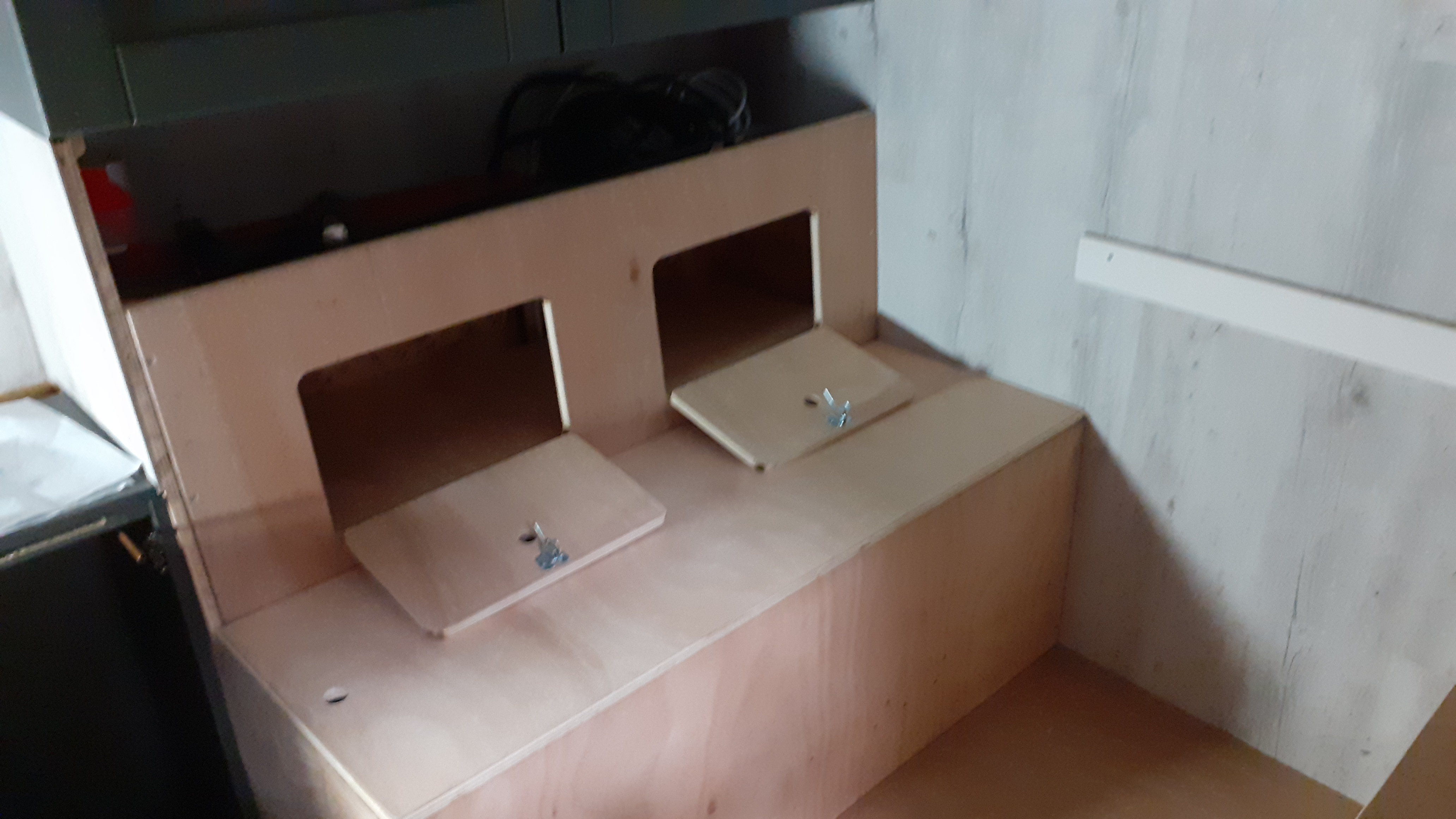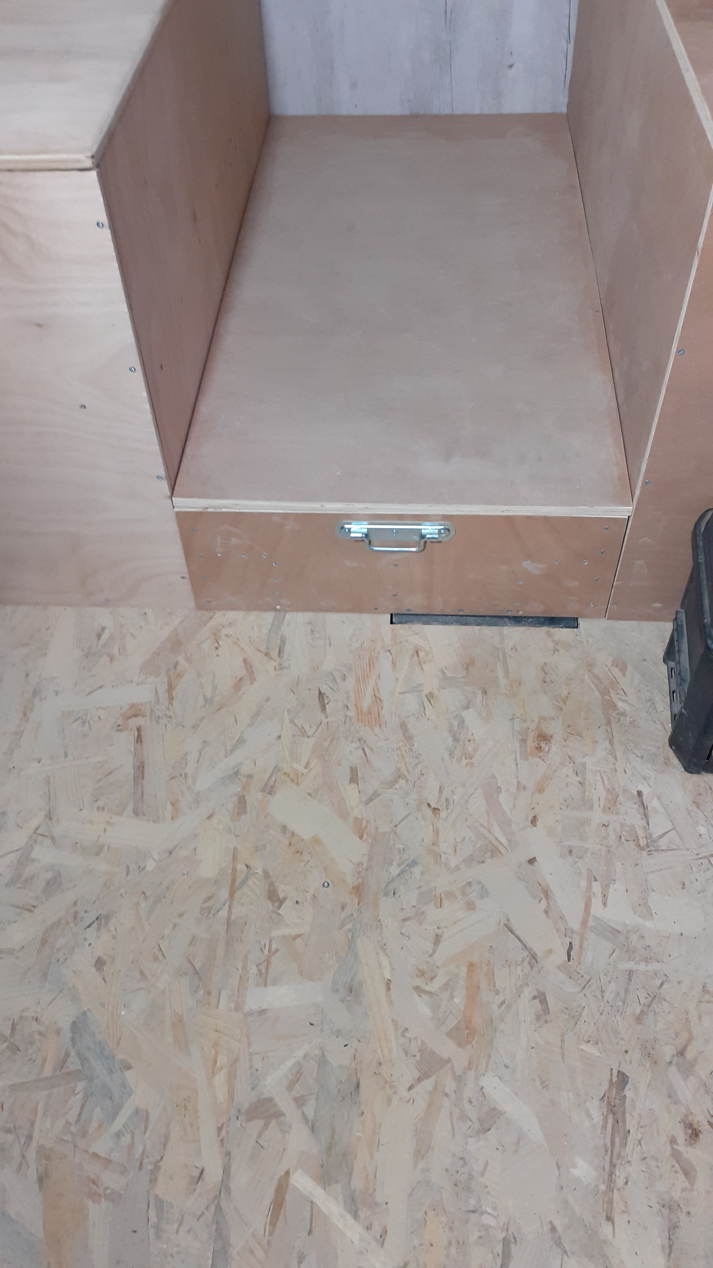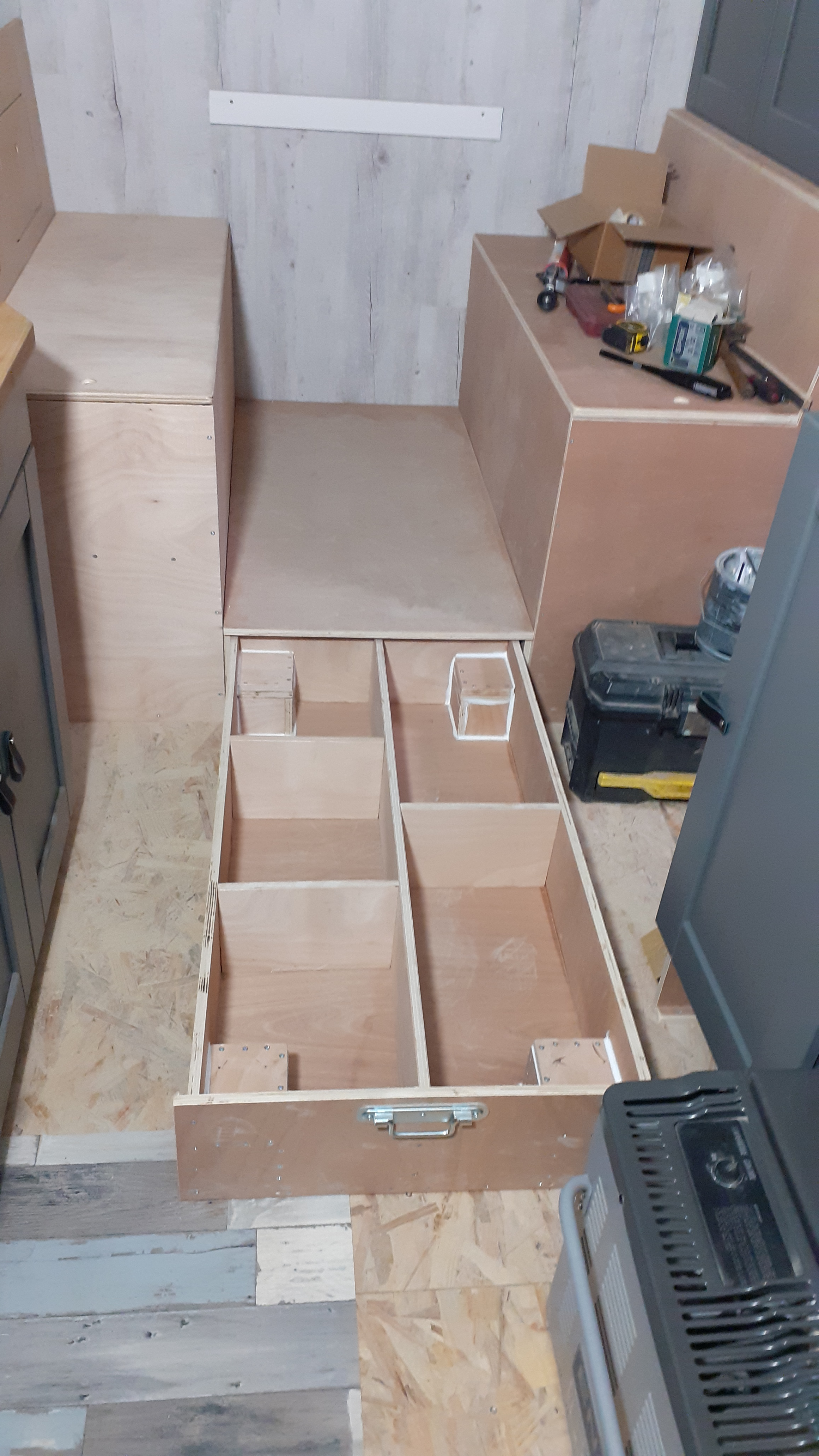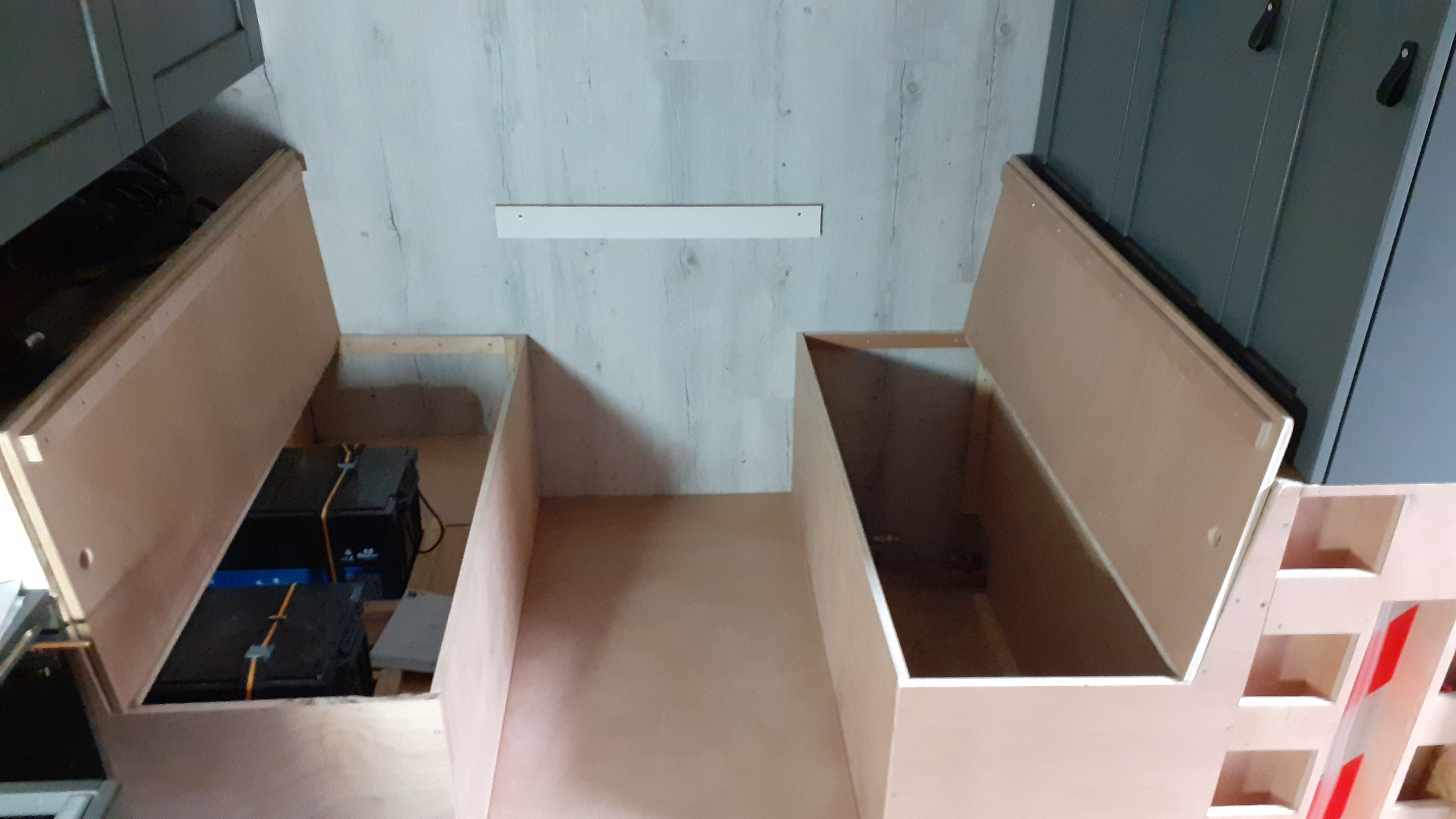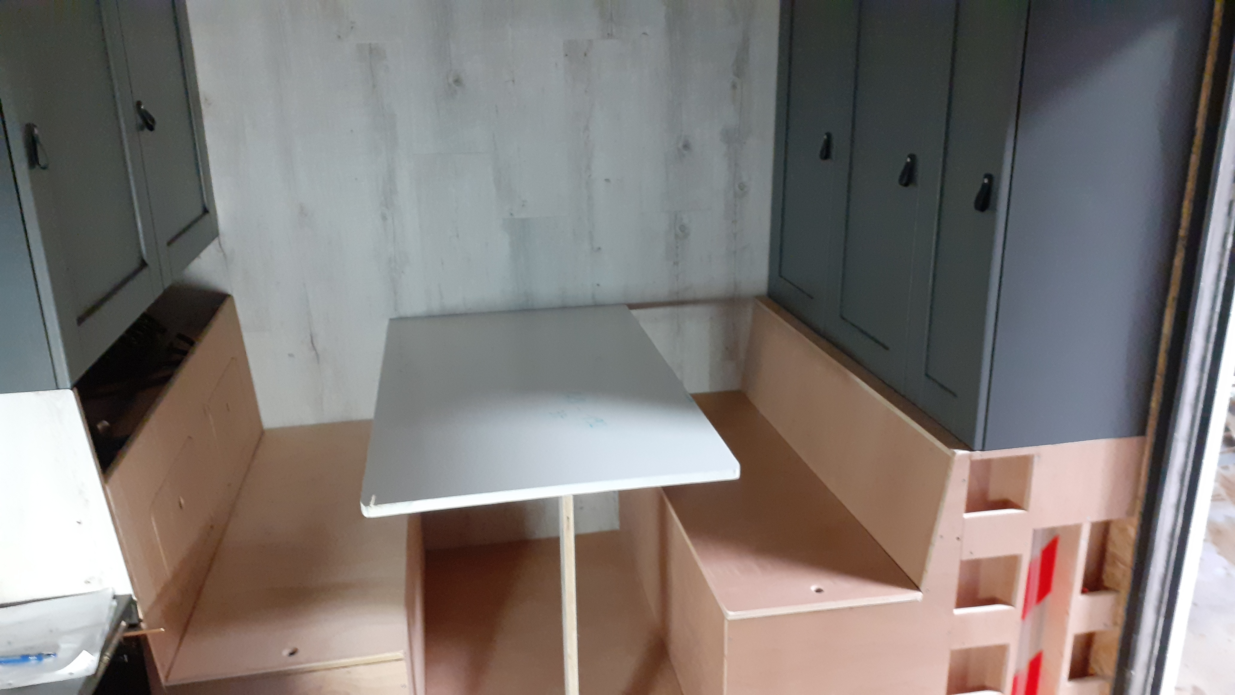 Coin repas bien avancé. Des grand coffres fonctionnels. Il reste beaucoup de finitions...