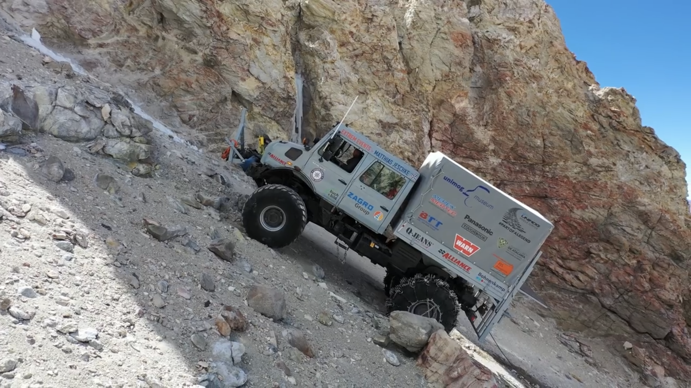 Pour la « flèche » au début j’ai pensé que c’était un cadre à tracter, mais ça s’apparente plus à une protection de treuil/porte roue de secours. Je pense que le seul but est de transporter une Rds et d’avancer un maximum le centre de gravité pour ne pas basculer en arrière. Le cadre à l’arrière est mobile et permet aussi une manutention plus facile des Rds. Le mettre plus bas permet également d’abaisser le centre de gravité Après je n’ai jamais vu de chaînes avec de tél clous Vraiment chouette cette vidéo
