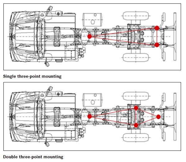 cqfd: 3 points ou 2 x 3 points, les deux points fixes au-dessus de l'essieu arrière et un pivot à l'avant si châssis court, deux pivots si châssis long