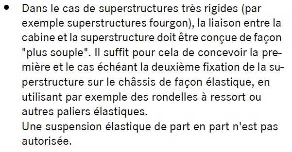 Edit PS : J'en profite pour re-dire la raison qui fait que les deux points fixes de la citerne de J Loo sont à l'AR puisque nous avons des caractéristiques de véhicules proches du sien juste au dessus. S'ils étaient à l'AV, toute la masse inertielle serait reportée sur l'essieu AV soit un truc du genre 2,9T + 4,5T = 7,4T et là nous serions en fort dépassement des capacités de la suspension AV (4,8T) (je parle de masse inertielle et non de poids) Donc pour monter une cellule, autant réfléchir avec les données de la cellule et pas avec celles de la citerne.