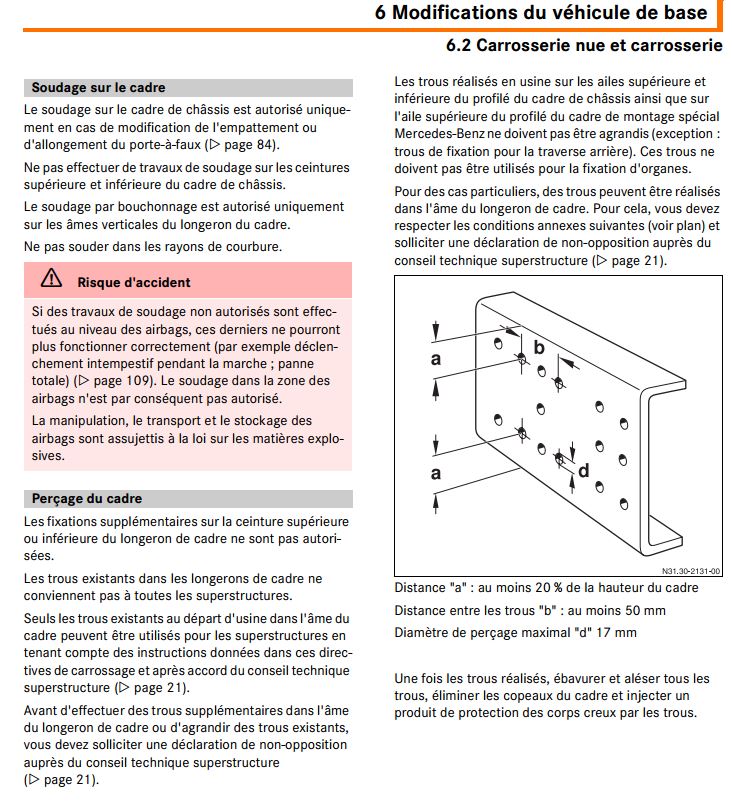 En France il est strictement interdit de percer, meuler, souder sur un châssis sans l'accord préalable du constructeur et un passage à la DREAL. Une fois de plus j'essaie de rester dans une logique "primaire", sécurisante si possible. J'en connais qui ont scié le châssis pour le rallonger (pas sur un 4x4) et c'est solide...