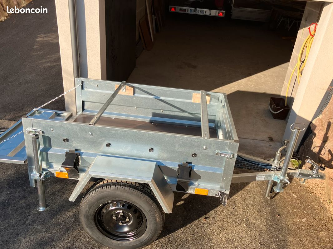vendue avec 2 béquilles stabilisatrices, 1 roue jockey, 2 cales de stationnement, ridelles avant et arrières ouvrantes retenues à l'horizontal et verrouillées par grenouillères à ressort permettant la pose de cadenas, 5 caissons hermétiques avec couvercles translucides de 45 et 55 litres.