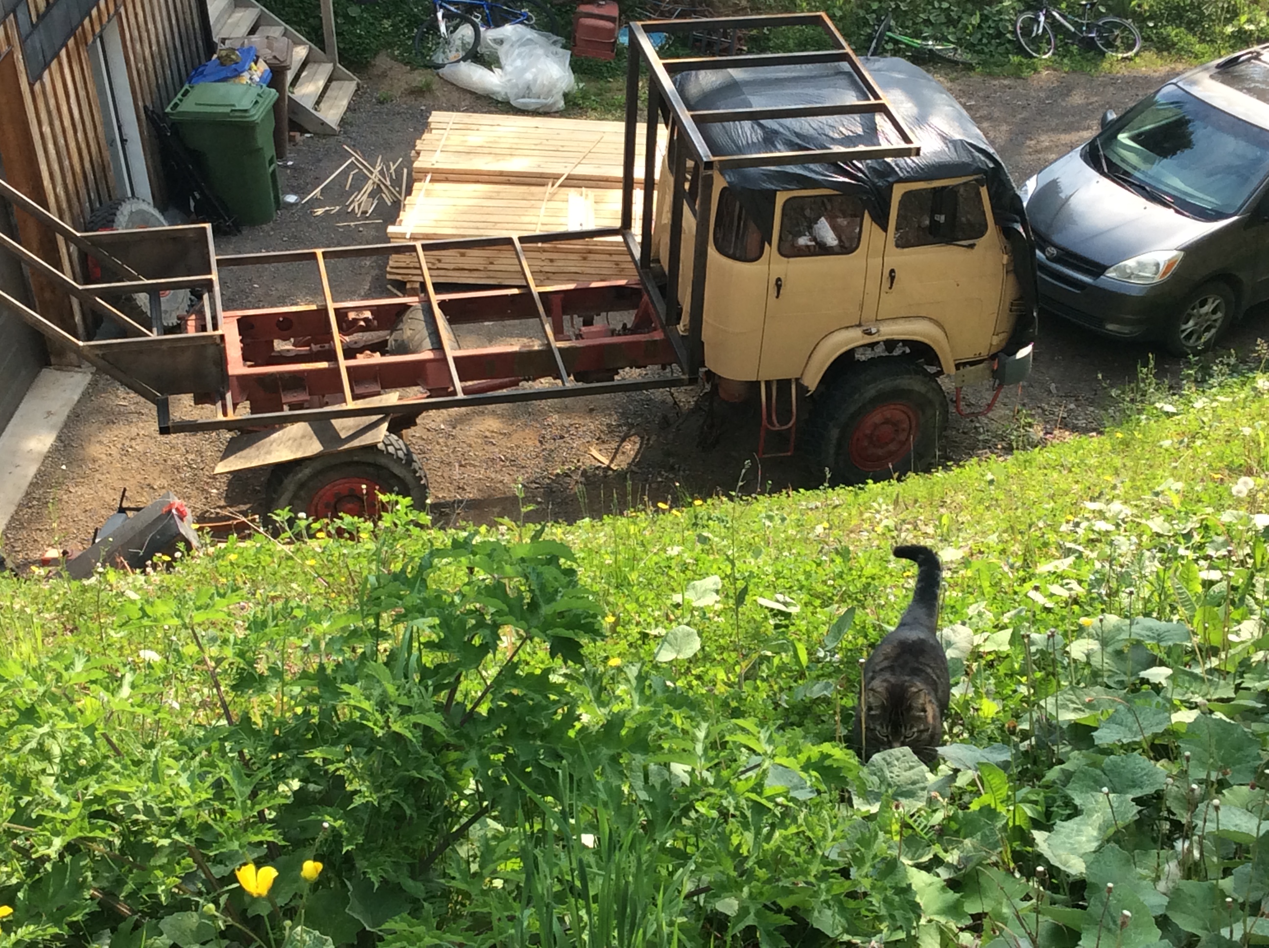 Pour répondre à la question: si je dois basculer la cabine il me faudra dans un premier temps soulever la cellule et la reculer pour dégager la capucine. J’ai conçu un système de pattes-verins qui me permettront de soulever la cellule en cas de besoin, même en cas de panne complète (moteur et/ou électrique). Ensuite, selon le cas, soit j’avance le camion (s’il n’est pas en rade complètement), soit je redepose la cellule sur le châssis sur des roulements et je la « tire » vers l’arrière. Je mettrai des photos au fur et à mesure de la fabrication.
