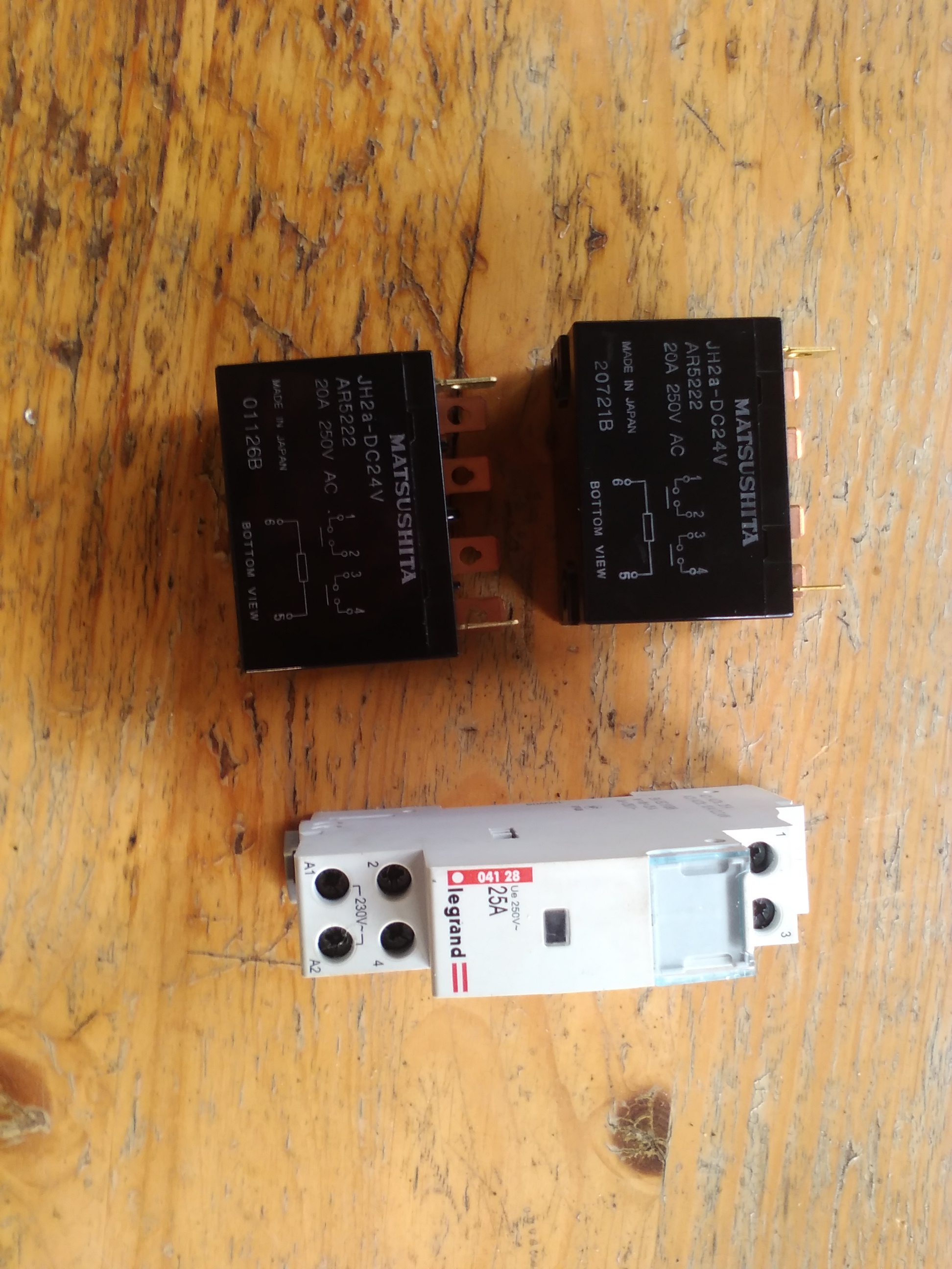 Une petite photo des relais que je vais utiliser, (avec le commutateur Legrand pour ceux qui voudraient se lancer dans le bricolage mais qui n'ont pas ce genre de relais 24V) :